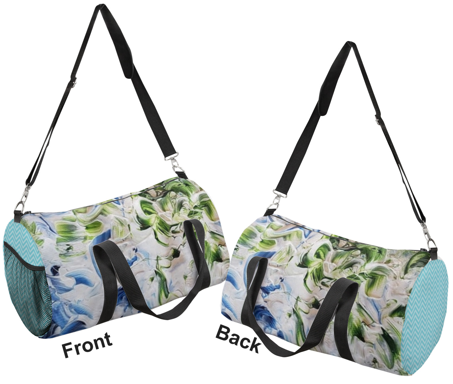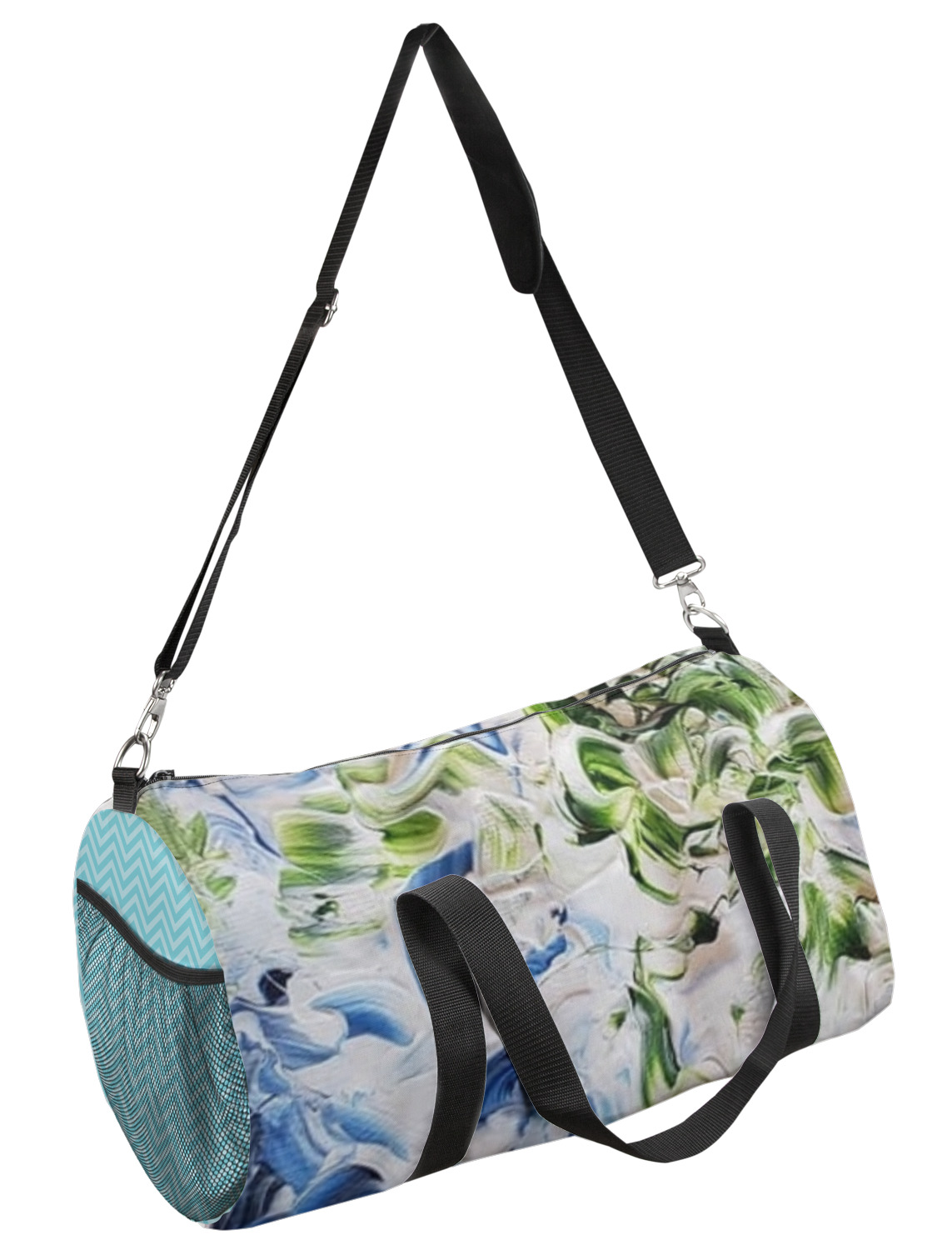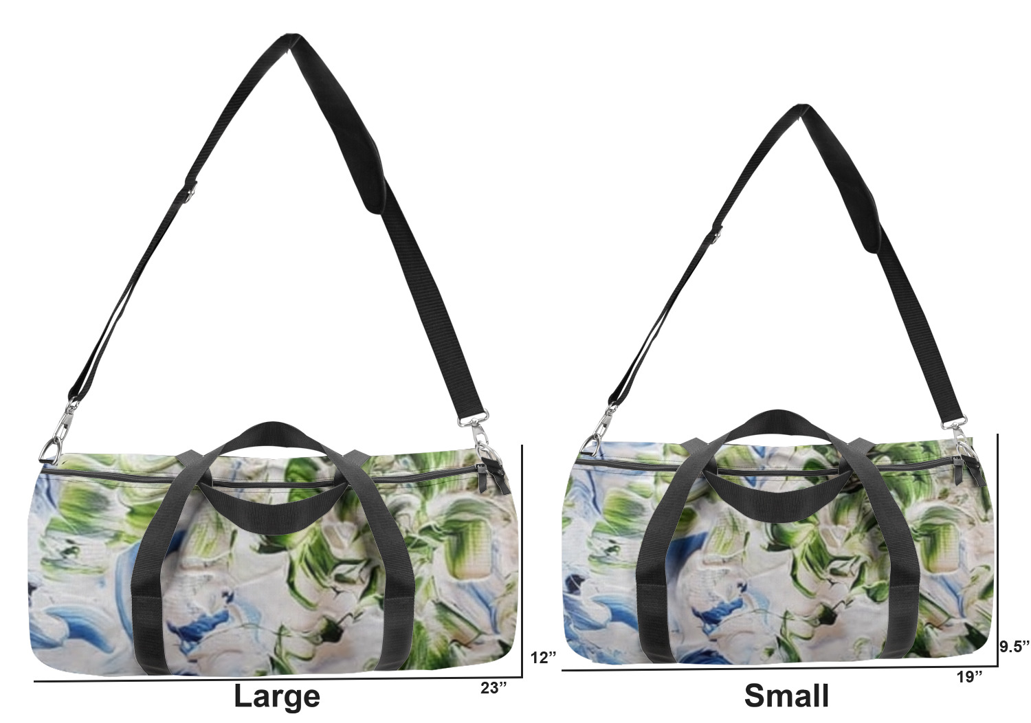 This duffle is a sturdy bag made of a canvas material. It comes in two sizes: Small (19"W x 9.5"H x 9.5"D) and Large (23"W x 12"H x 12"D). The bag is a cylindrical shape with a black adjustable strap and two handles. On one side is an elastic pouch to put a waterbottle or other small item. Your product will be sublimated with your design and is able to be designed on the front, back, and sides. Be sure to remember that the straps may cut into parts of your design if you upload your own artwork.