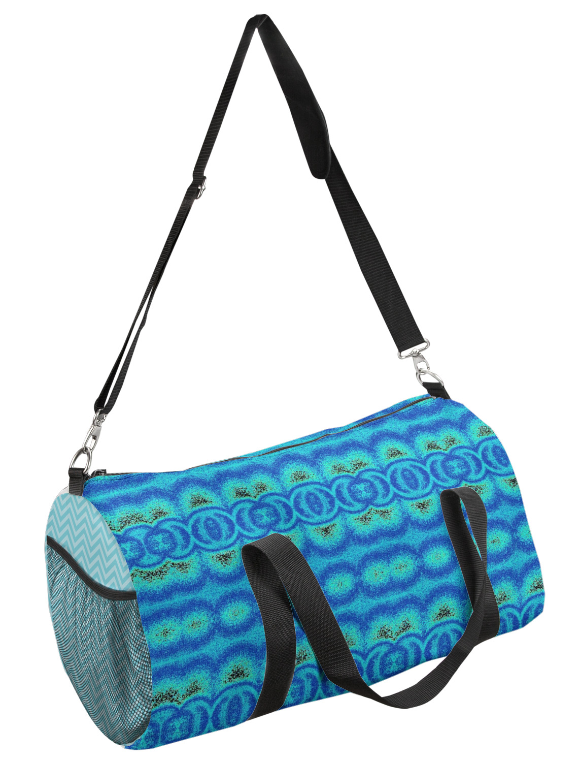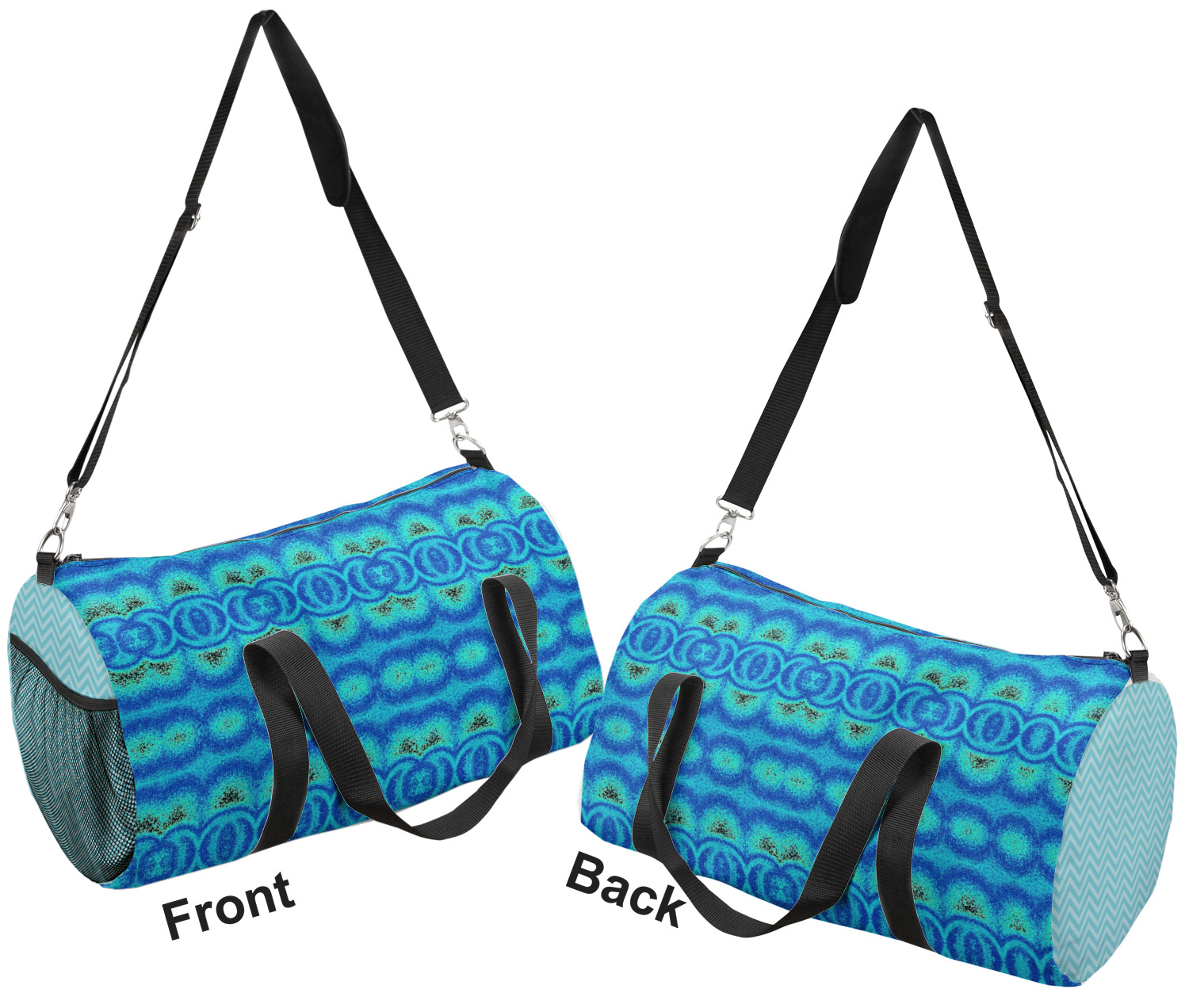 This duffle is a sturdy bag made of a canvas material. It comes in two sizes: Small (19"W x 9.5"H x 9.5"D) and Large (23"W x 12"H x 12"D). The bag is a cylindrical shape with a black adjustable strap and two handles. On one side is an elastic pouch to put a waterbottle or other small item. Your product will be sublimated with your design and is able to be designed on the front, back, and sides. Be sure to remember that the straps may cut into parts of your design if you upload your own artwork.