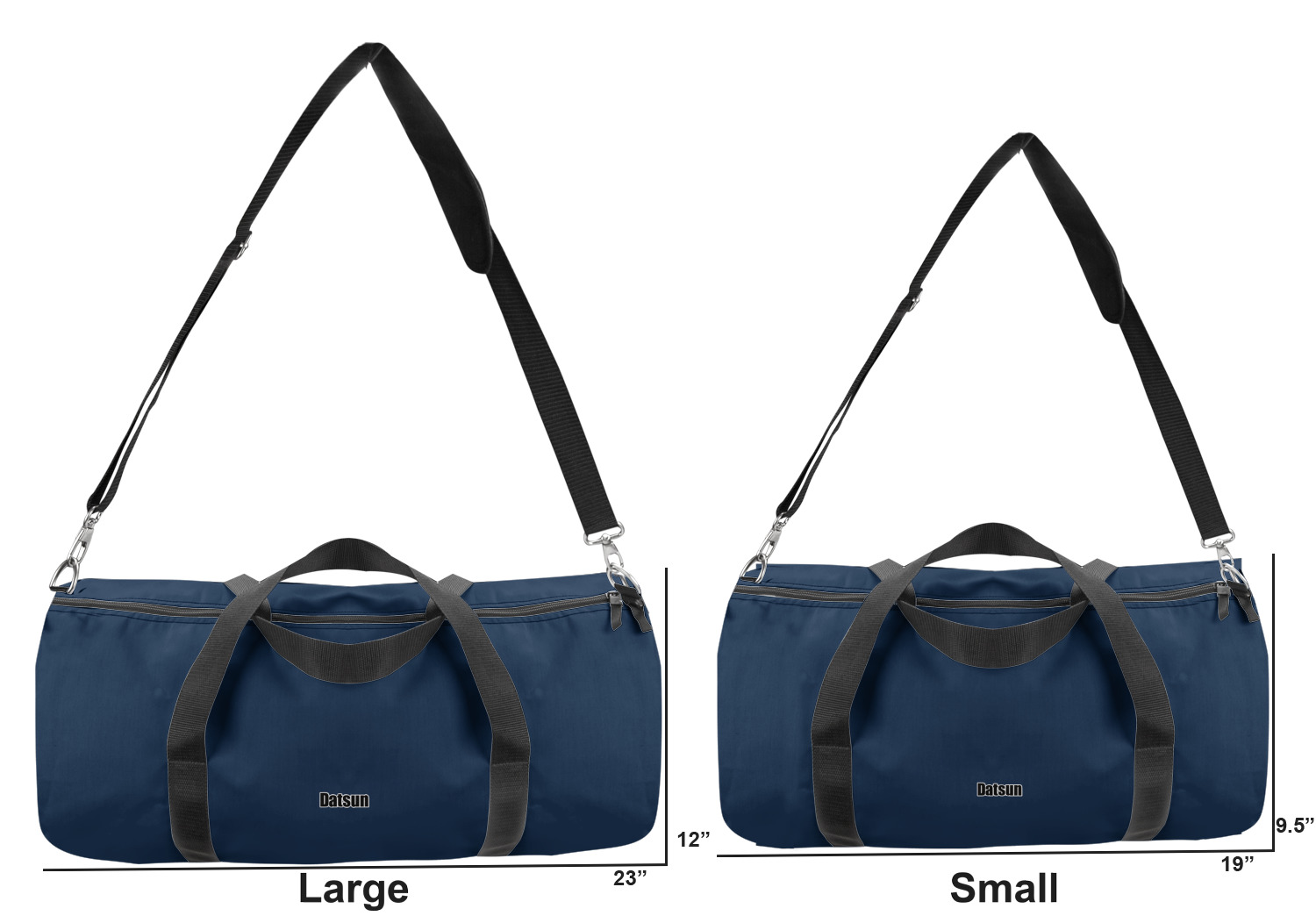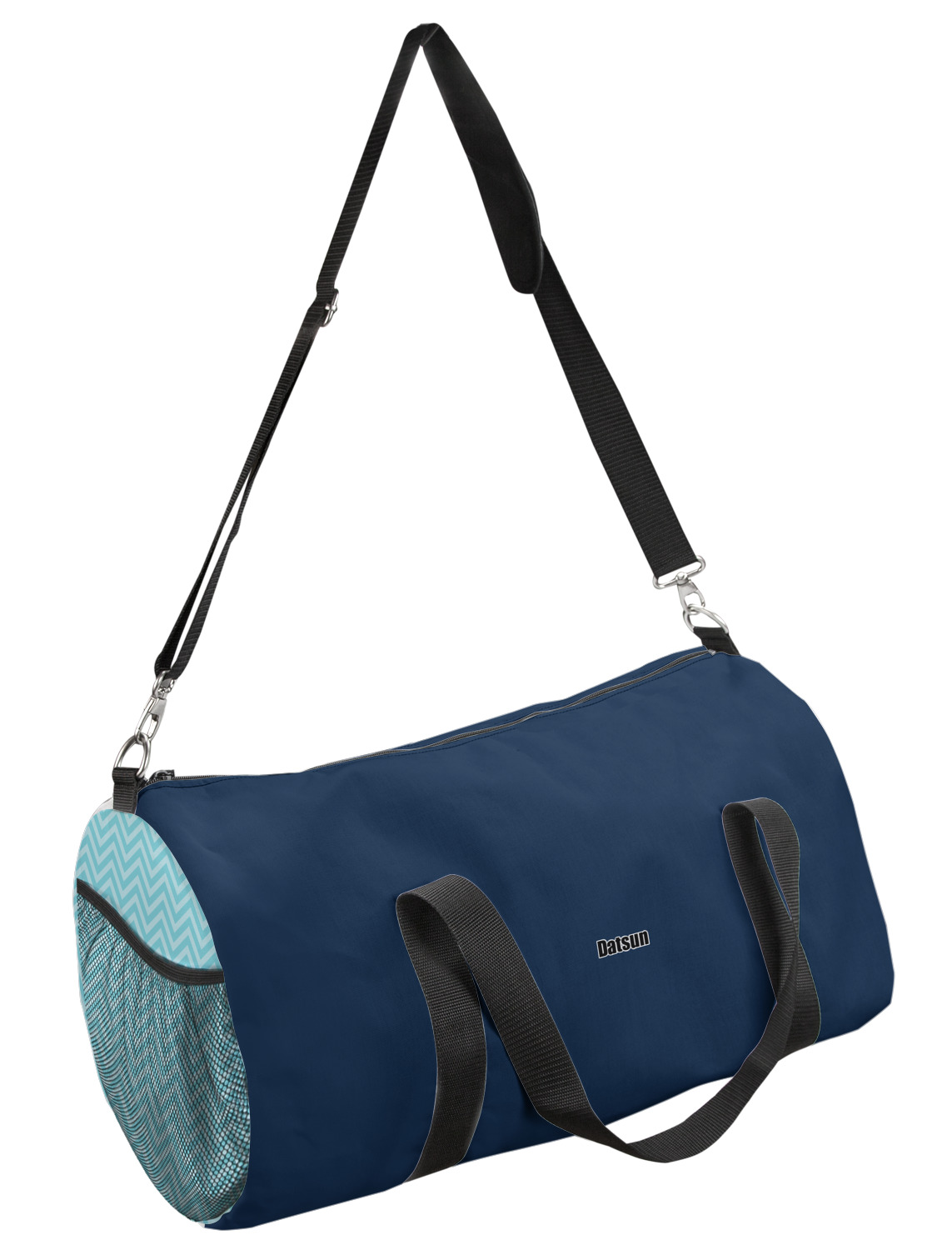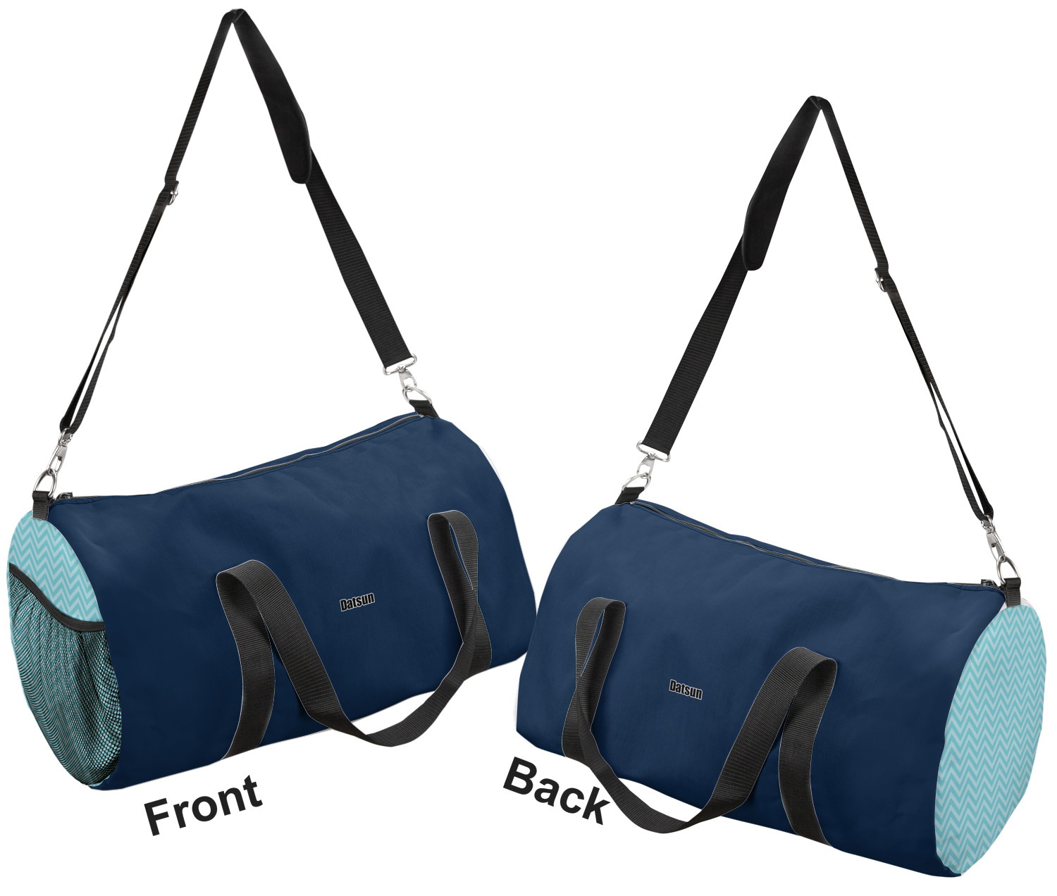 This duffle is a sturdy bag made of a canvas material. It comes in two sizes: Small (19"W x 9.5"H x 9.5"D) and Large (23"W x 12"H x 12"D). The bag is a cylindrical shape with a black adjustable strap and two handles. On one side is an elastic pouch to put a waterbottle or other small item. Your product will be sublimated with your design and is able to be designed on the front, back, and sides. Be sure to remember that the straps may cut into parts of your design if you upload your own artwork.