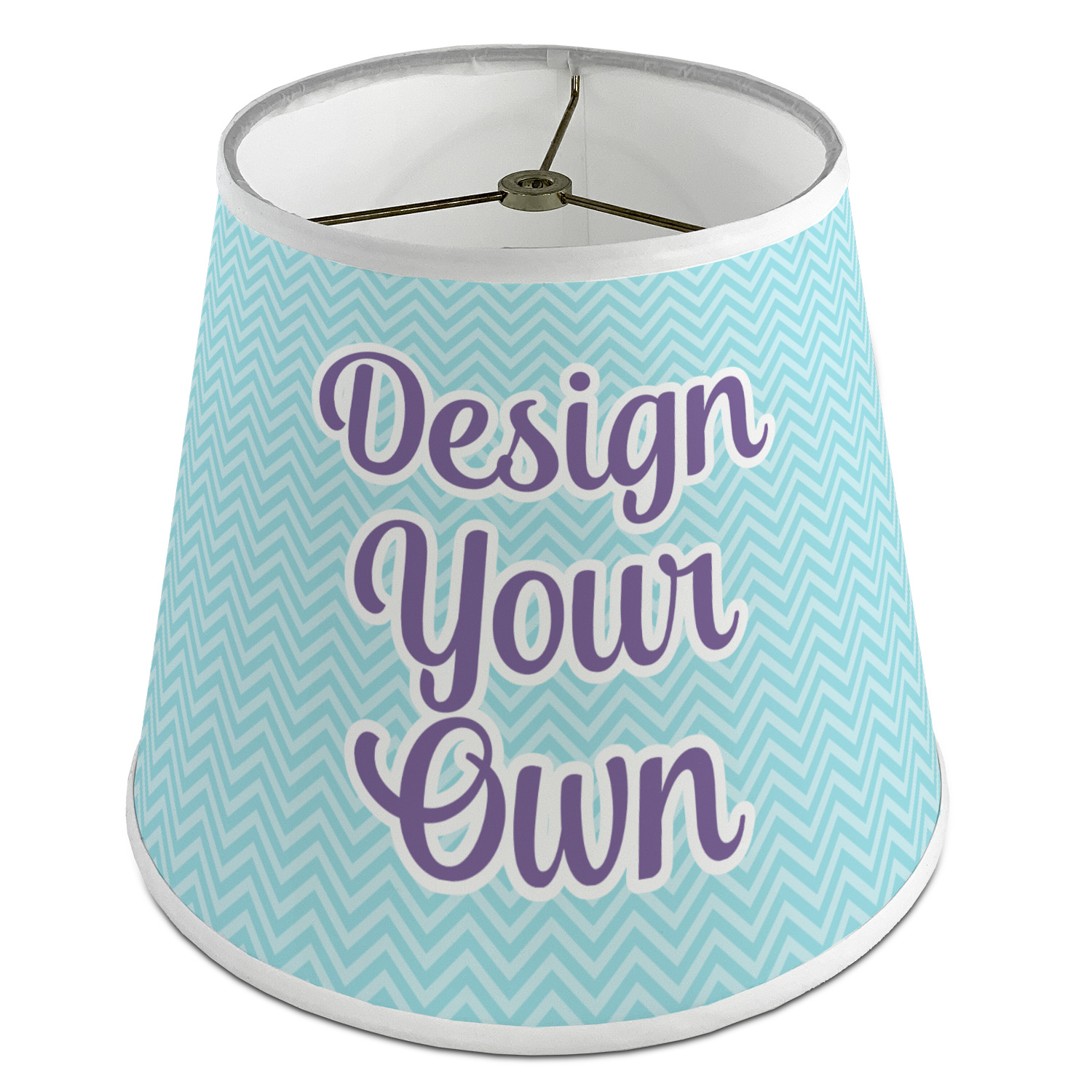 The base of this lampshade is 12 inches in diameter, and the top spans 8 inches in diameter. The total height of the lampshade is 10 inches. The angled nature of this custom lampshade concentrates the light, making it ideal for smaller spaces. This lampshade is made of matte, polyfilm, and displays your customization in its middle. The top and bottom of this colorful lamp shade are lined with a white fabric ribbon (which can be replaced with black inside the design studio) which frames your design and creates a sophisticated finish. As an UNO fitter lampshade, this unique lamp shade will fit a variety of bases.