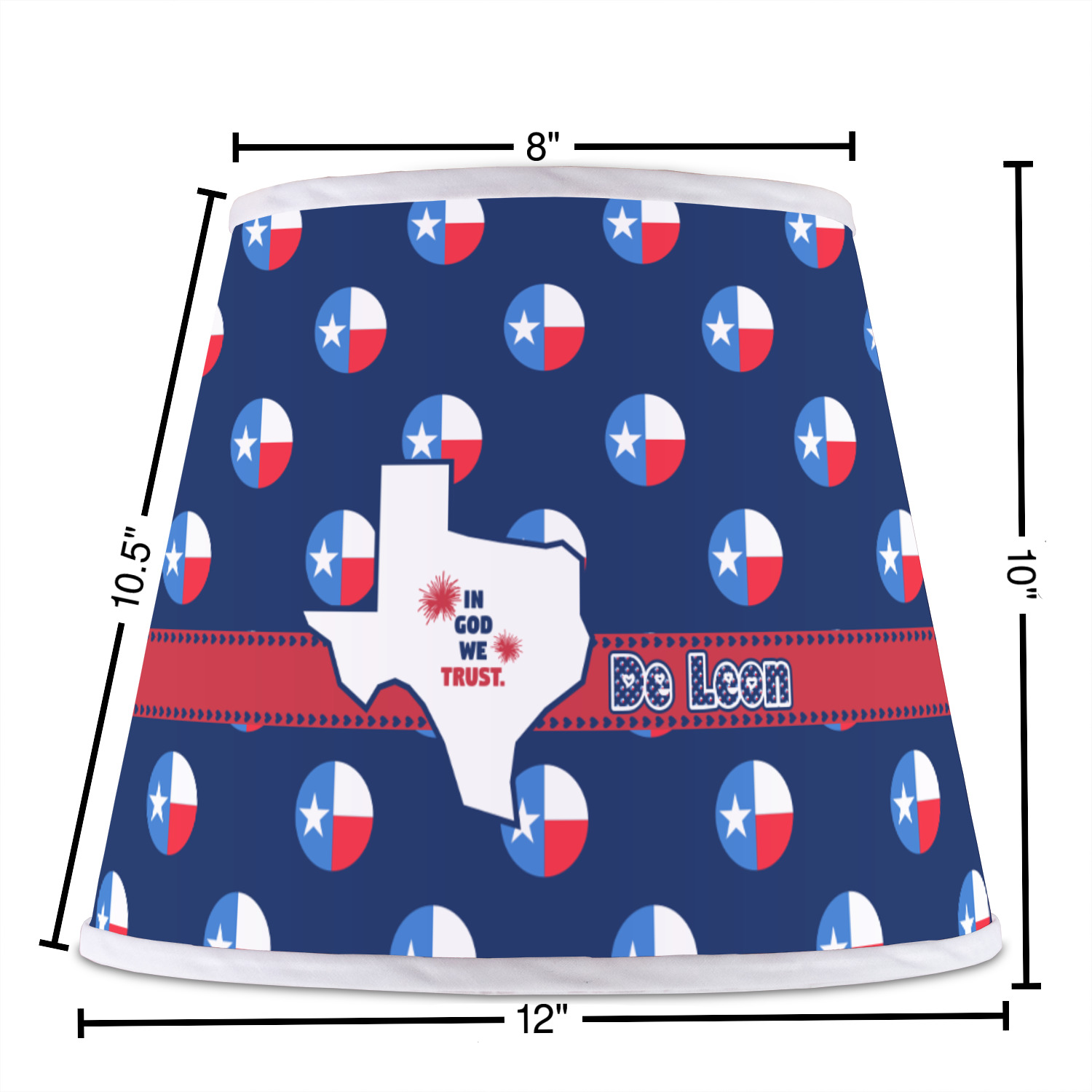 The base of this lampshade is 12 inches in diameter, and the top spans 8 inches in diameter. The total height of the lampshade is 10 inches. The angled nature of this custom lampshade concentrates the light, making it ideal for smaller spaces. This lampshade is made of matte, polyfilm, and displays your customization in its middle. The top and bottom of this colorful lamp shade are lined with a white fabric ribbon (which can be replaced with black inside the design studio) which frames your design and creates a sophisticated finish. As an UNO fitter lampshade, this unique lamp shade will fit a variety of bases.