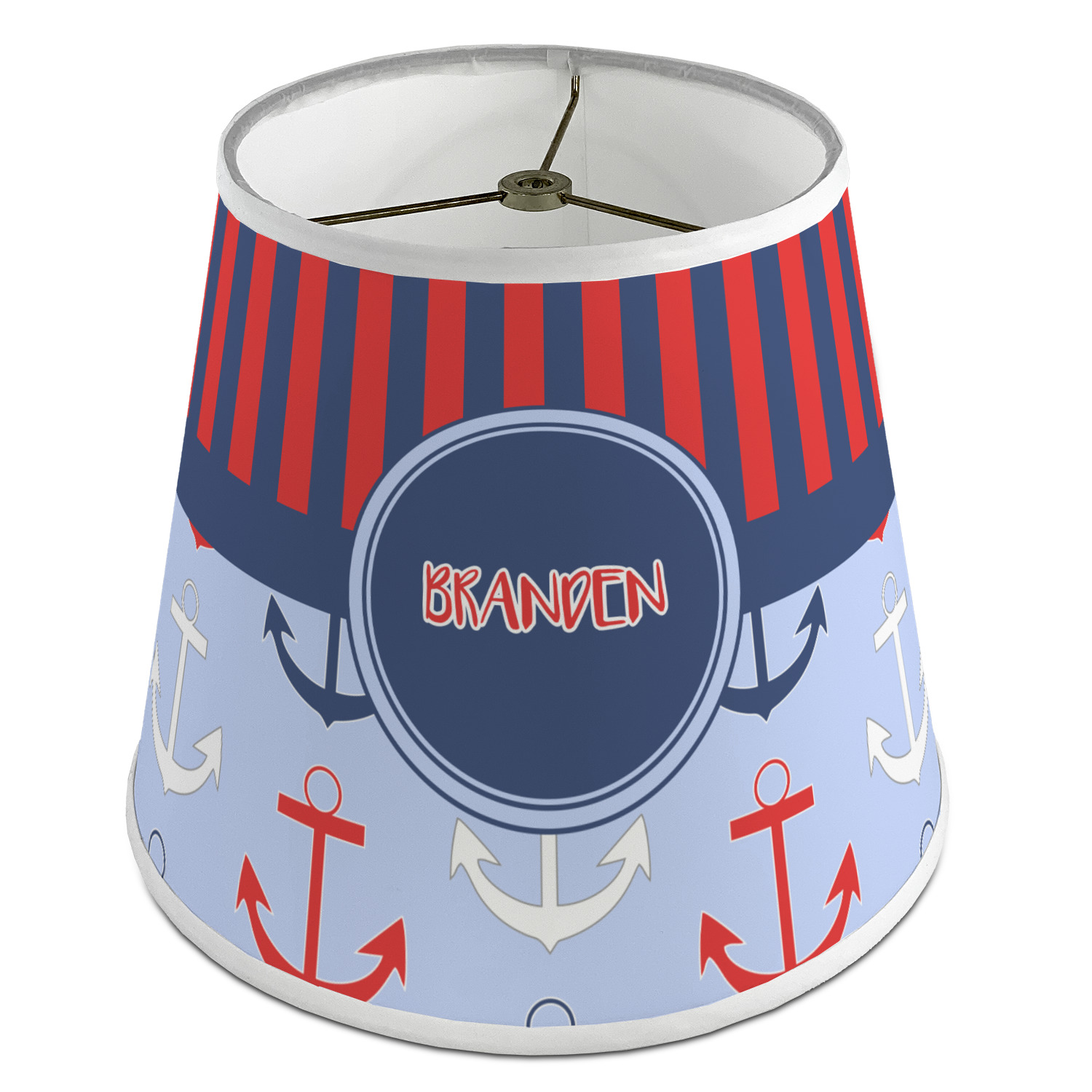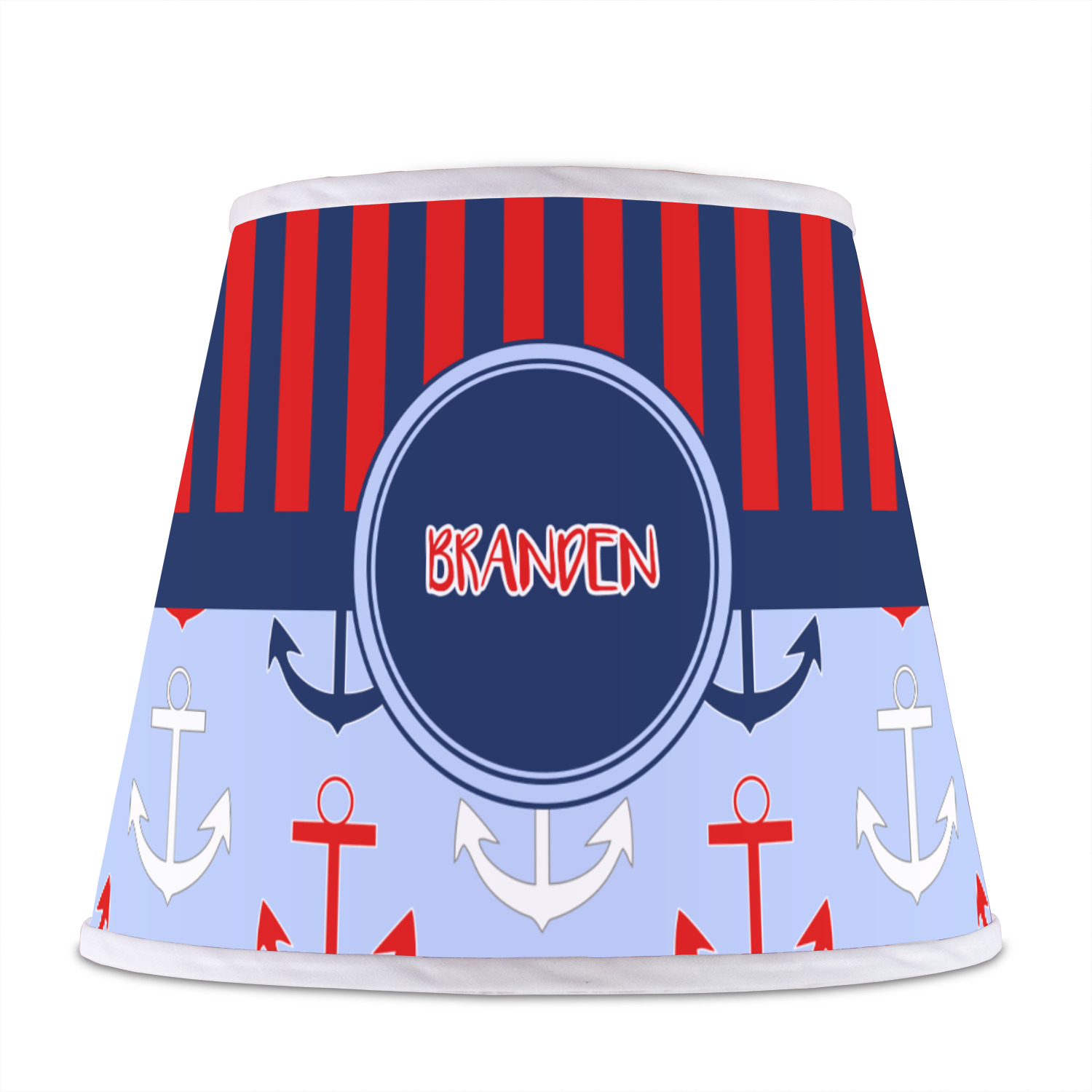 The base of this lampshade is 12 inches in diameter, and the top spans 8 inches in diameter. The total height of the lampshade is 10 inches. The angled nature of this custom lampshade concentrates the light, making it ideal for smaller spaces. This lampshade is made of matte, polyfilm, and displays your customization in its middle. The top and bottom of this colorful lamp shade are lined with a white fabric ribbon (which can be replaced with black inside the design studio) which frames your design and creates a sophisticated finish. As an UNO fitter lampshade, this unique lamp shade will fit a variety of bases.