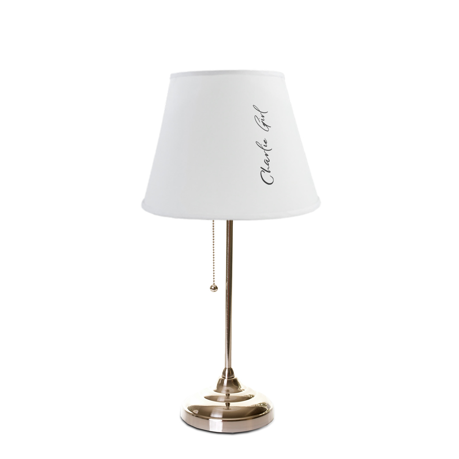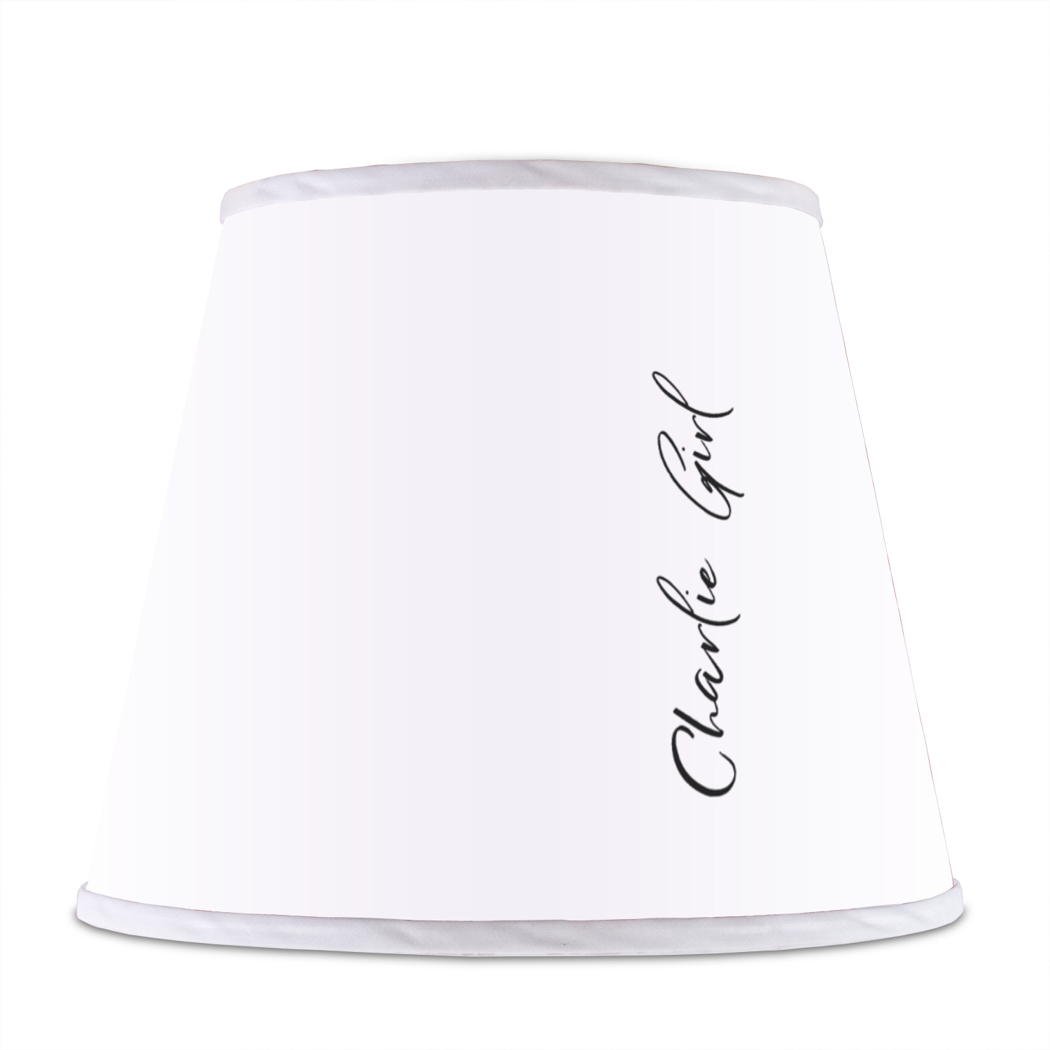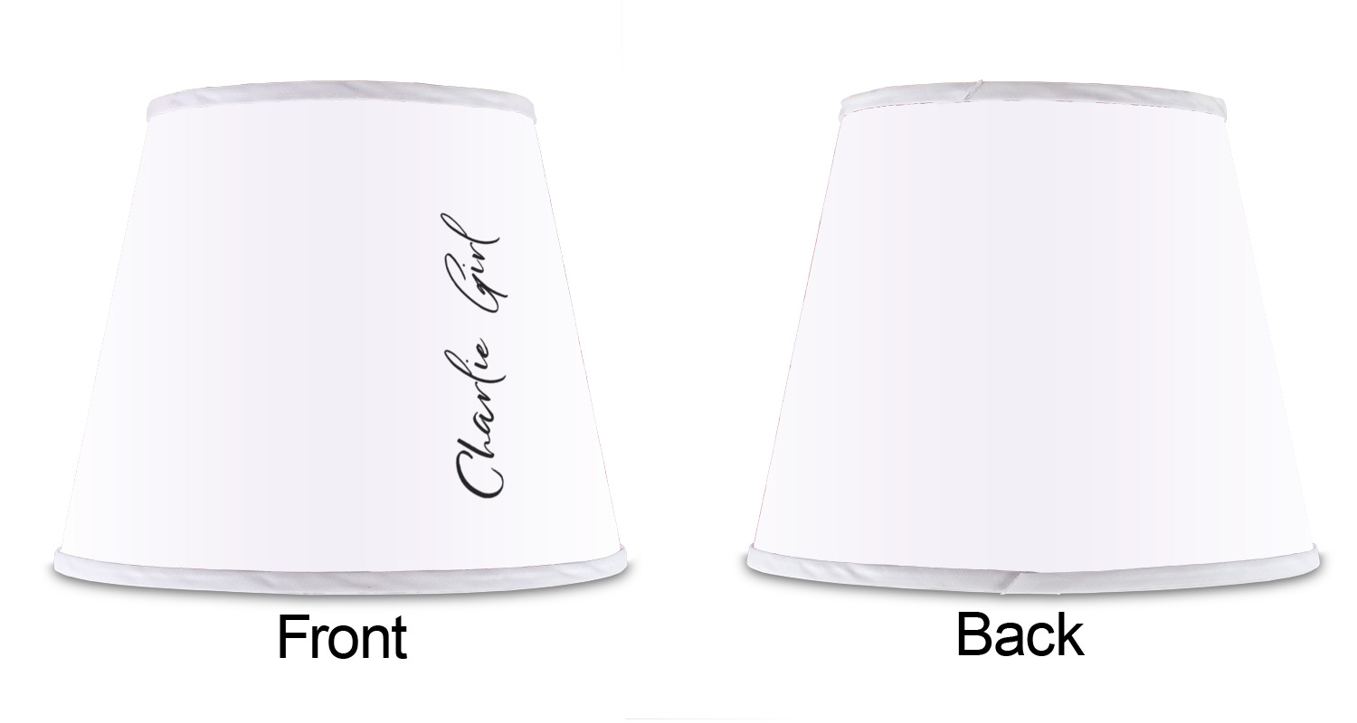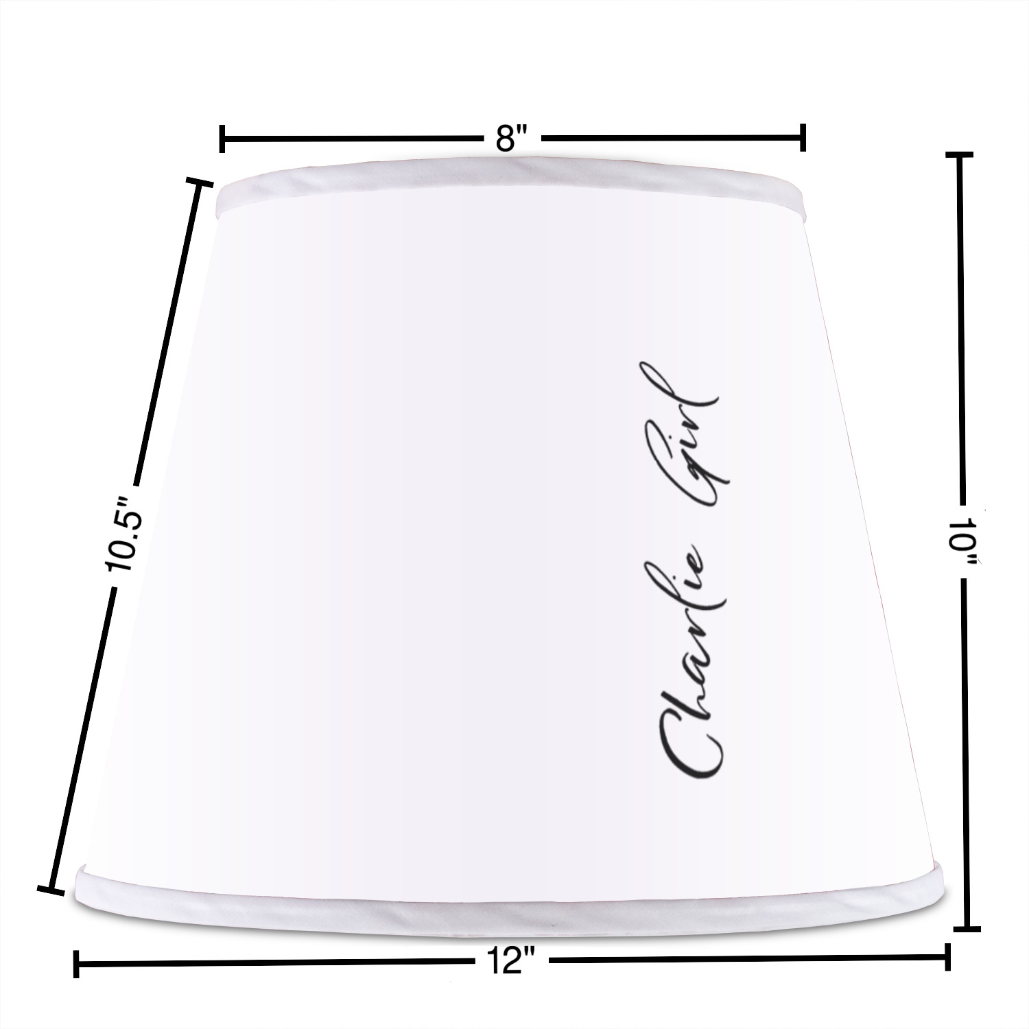 The base of this lampshade is 12 inches in diameter, and the top spans 8 inches in diameter. The total height of the lampshade is 10 inches. The angled nature of this custom lampshade concentrates the light, making it ideal for smaller spaces. This lampshade is made of matte, polyfilm, and displays your customization in its middle. The top and bottom of this colorful lamp shade are lined with a white fabric ribbon (which can be replaced with black inside the design studio) which frames your design and creates a sophisticated finish. As an UNO fitter lampshade, this unique lamp shade will fit a variety of bases.