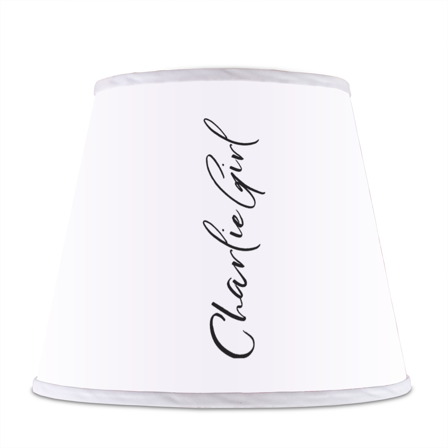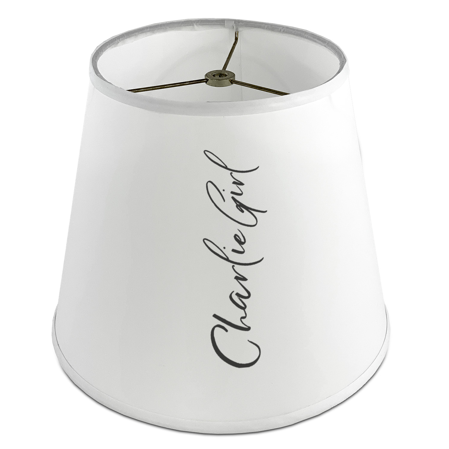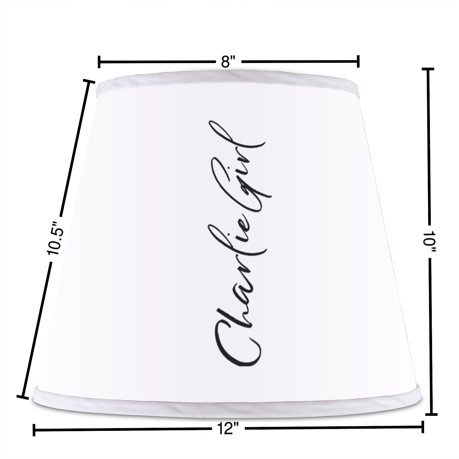 The base of this lampshade is 12 inches in diameter, and the top spans 8 inches in diameter. The total height of the lampshade is 10 inches. The angled nature of this custom lampshade concentrates the light, making it ideal for smaller spaces. This lampshade is made of matte, polyfilm, and displays your customization in its middle. The top and bottom of this colorful lamp shade are lined with a white fabric ribbon (which can be replaced with black inside the design studio) which frames your design and creates a sophisticated finish. As an UNO fitter lampshade, this unique lamp shade will fit a variety of bases.