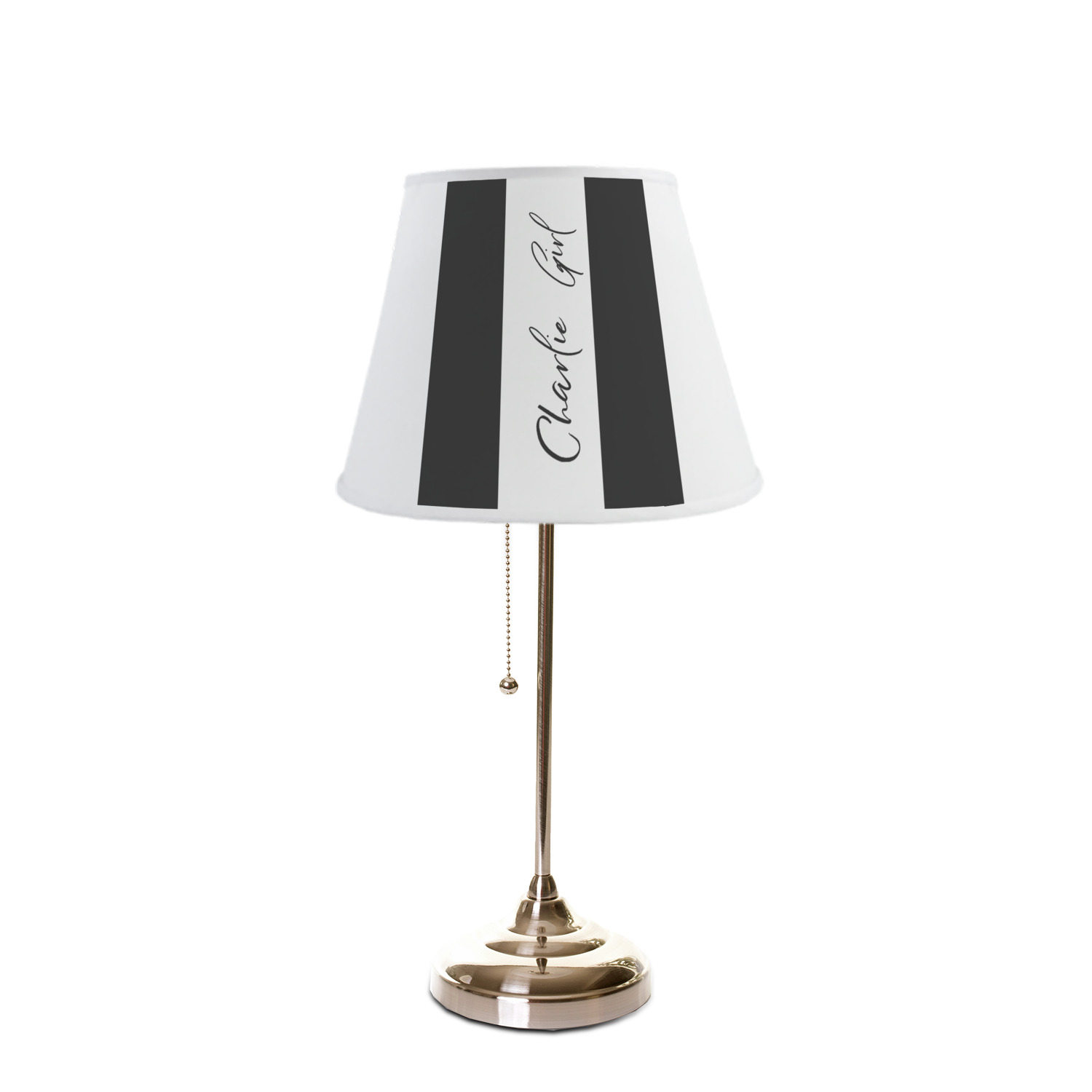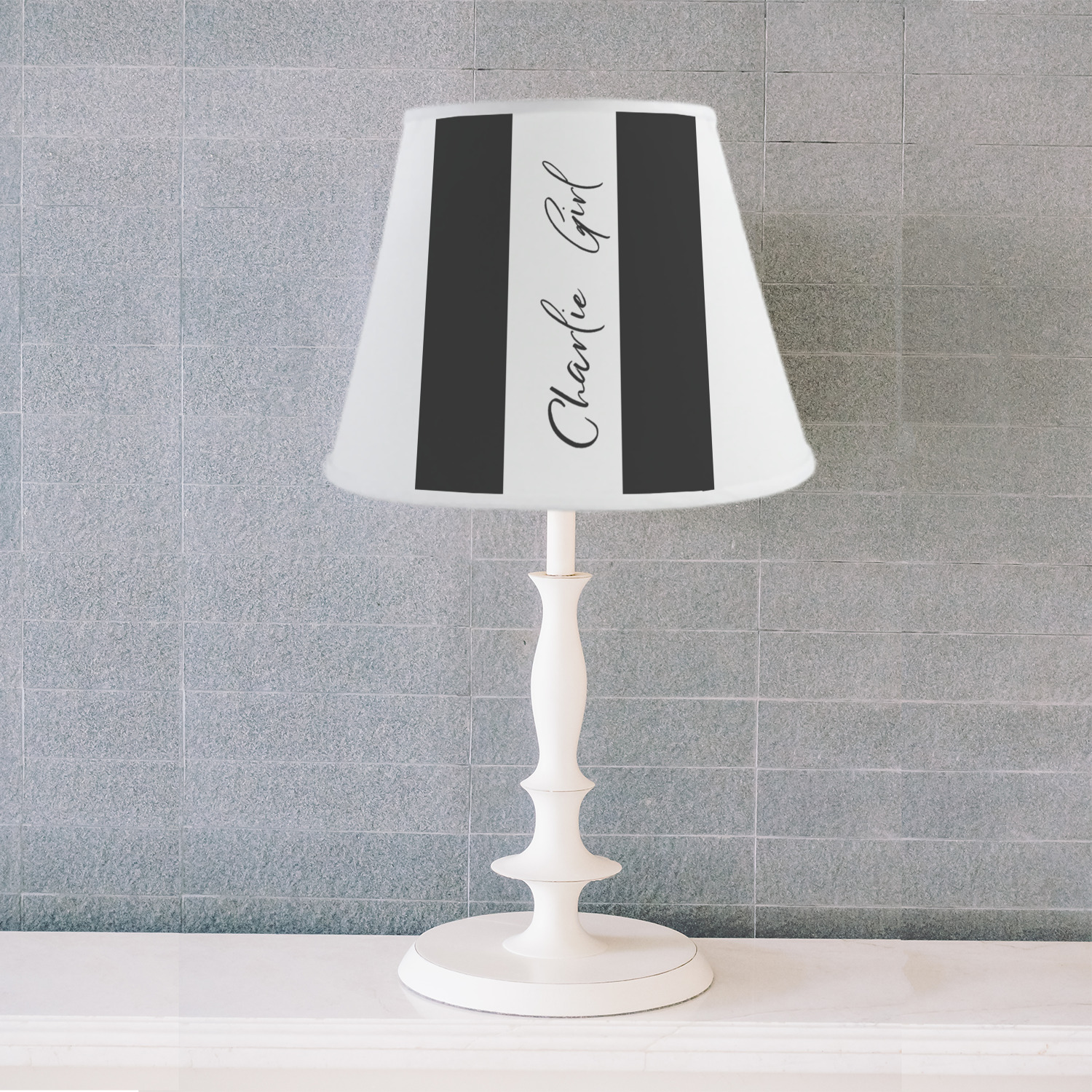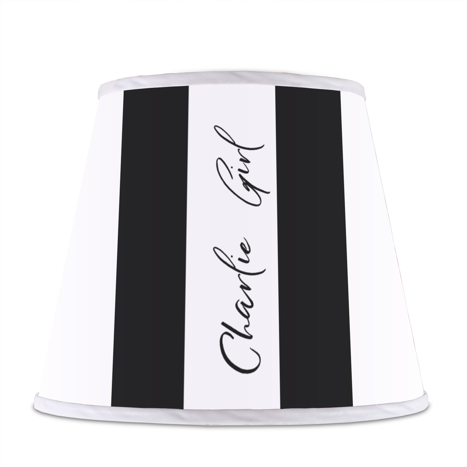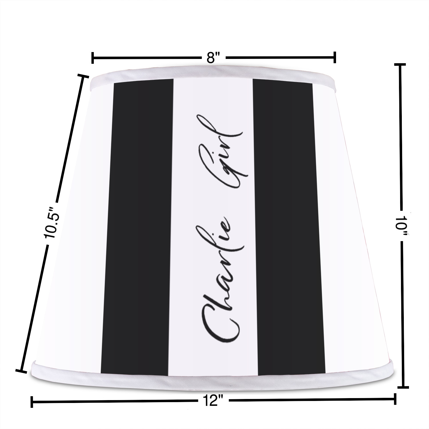 The base of this lampshade is 12 inches in diameter, and the top spans 8 inches in diameter. The total height of the lampshade is 10 inches. The angled nature of this custom lampshade concentrates the light, making it ideal for smaller spaces. This lampshade is made of matte, polyfilm, and displays your customization in its middle. The top and bottom of this colorful lamp shade are lined with a white fabric ribbon (which can be replaced with black inside the design studio) which frames your design and creates a sophisticated finish. As an UNO fitter lampshade, this unique lamp shade will fit a variety of bases.