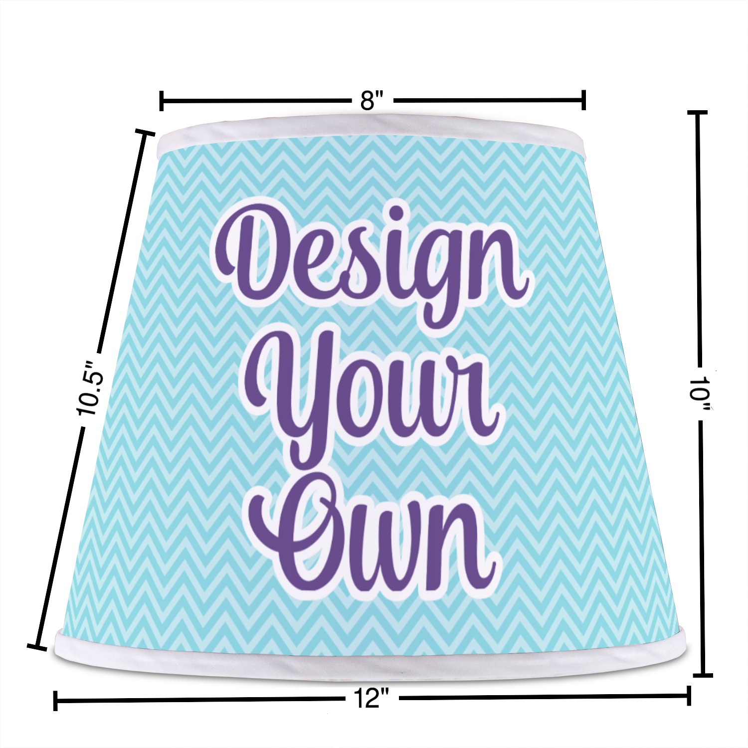 The base of this lampshade is 12 inches in diameter, and the top spans 8 inches in diameter. The total height of the lampshade is 10 inches. The angled nature of this custom lampshade concentrates the light, making it ideal for smaller spaces. This lampshade is made of matte, polyfilm, and displays your customization in its middle. The top and bottom of this colorful lamp shade are lined with a white fabric ribbon (which can be replaced with black inside the design studio) which frames your design and creates a sophisticated finish. As an UNO fitter lampshade, this unique lamp shade will fit a variety of bases.