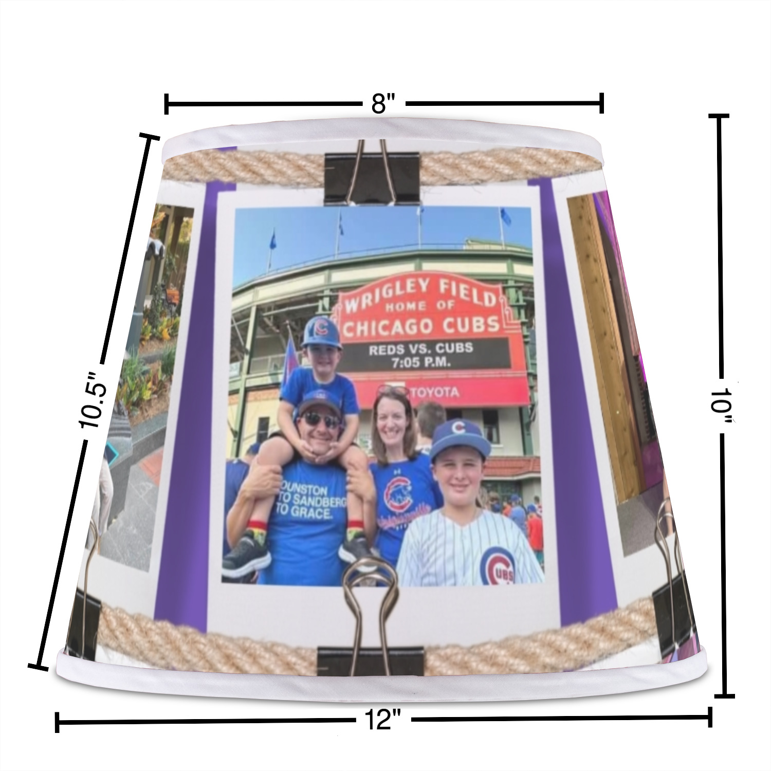 The base of this lampshade is 12 inches in diameter, and the top spans 8 inches in diameter. The total height of the lampshade is 10 inches. The angled nature of this custom lampshade concentrates the light, making it ideal for smaller spaces. This lampshade is made of matte, polyfilm, and displays your customization in its middle. The top and bottom of this colorful lamp shade are lined with a white fabric ribbon (which can be replaced with black inside the design studio) which frames your design and creates a sophisticated finish. As an UNO fitter lampshade, this unique lamp shade will fit a variety of bases.