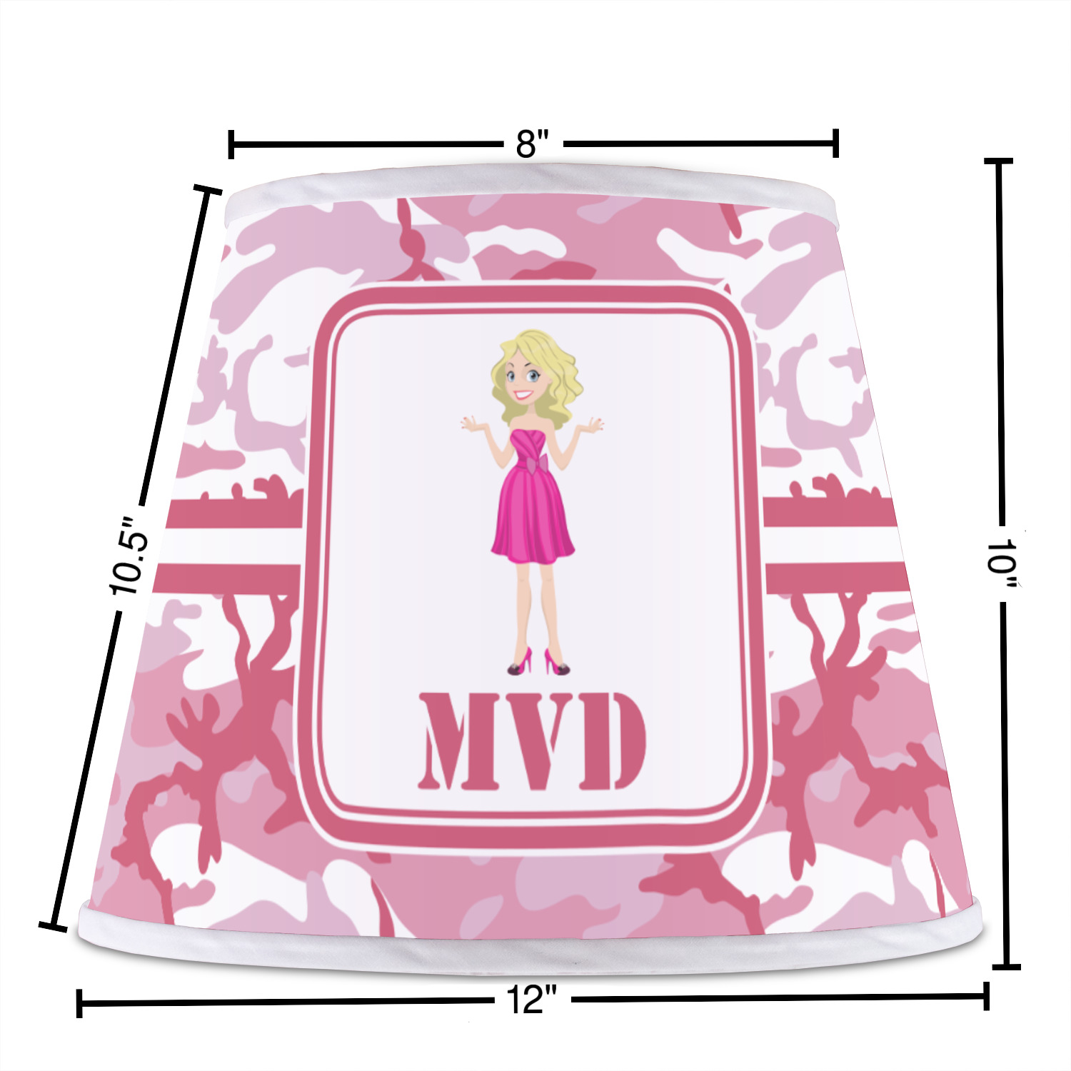 The base of this lampshade is 12 inches in diameter, and the top spans 8 inches in diameter. The total height of the lampshade is 10 inches. The angled nature of this custom lampshade concentrates the light, making it ideal for smaller spaces. This lampshade is made of matte, polyfilm, and displays your customization in its middle. The top and bottom of this colorful lamp shade are lined with a white fabric ribbon (which can be replaced with black inside the design studio) which frames your design and creates a sophisticated finish. As an UNO fitter lampshade, this unique lamp shade will fit a variety of bases.