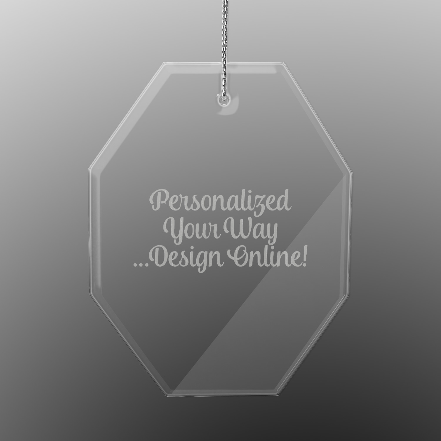 We offer four different clear glass ornaments to personalize. Available in round or octagon shape. Each glass ornament is engraved with a design of your choice. Create a quote, use a photo, or logo for us to etch into your custom ornament. We pair each ornament with a silver string for you to hang on your Christmas tree!