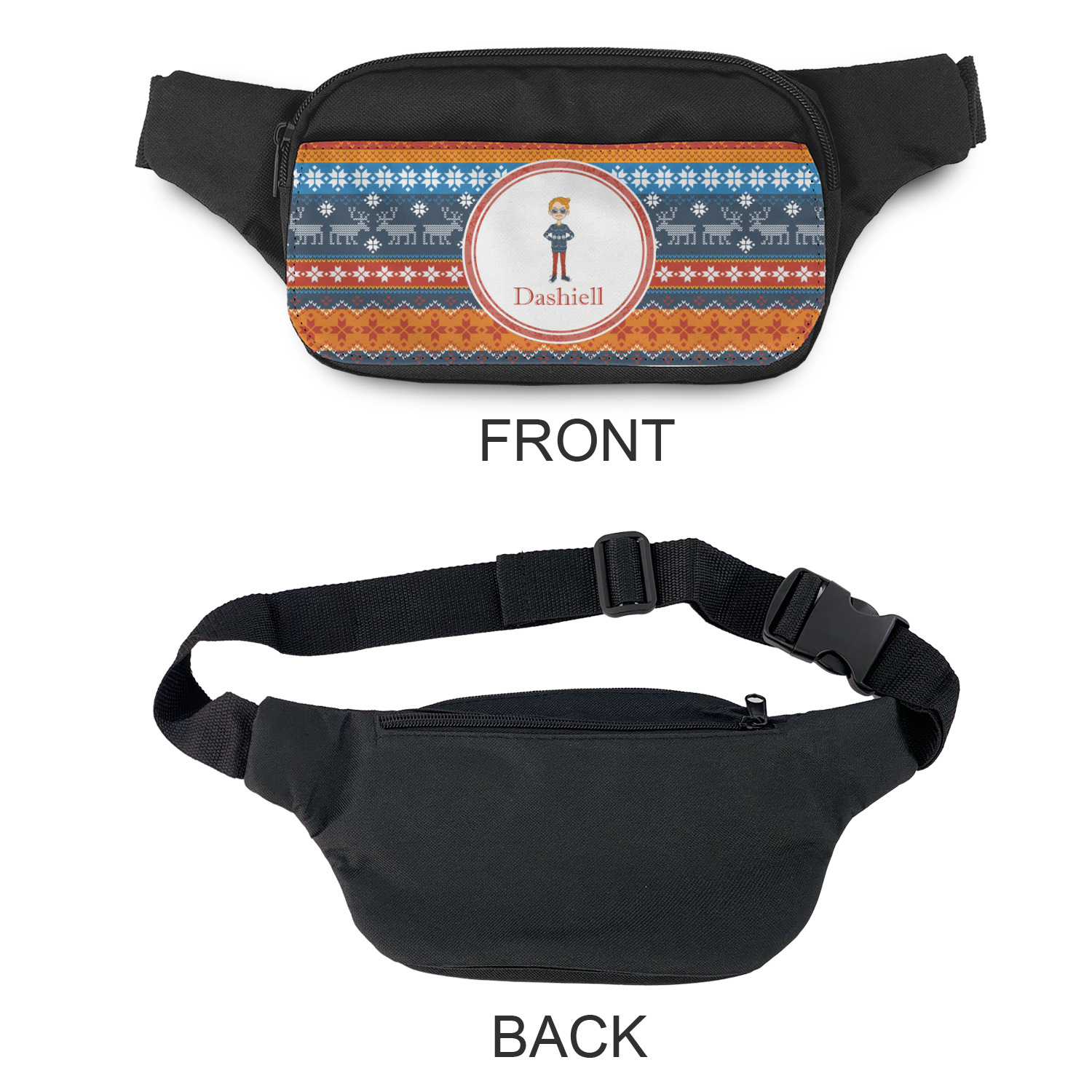 This is a unisex fanny pack - suitable for both men & women. The front flap is printed in full color with your design. You can add a photo, logo or any image that you would like. We offer a number of design templates that can be customized by you to your liking.