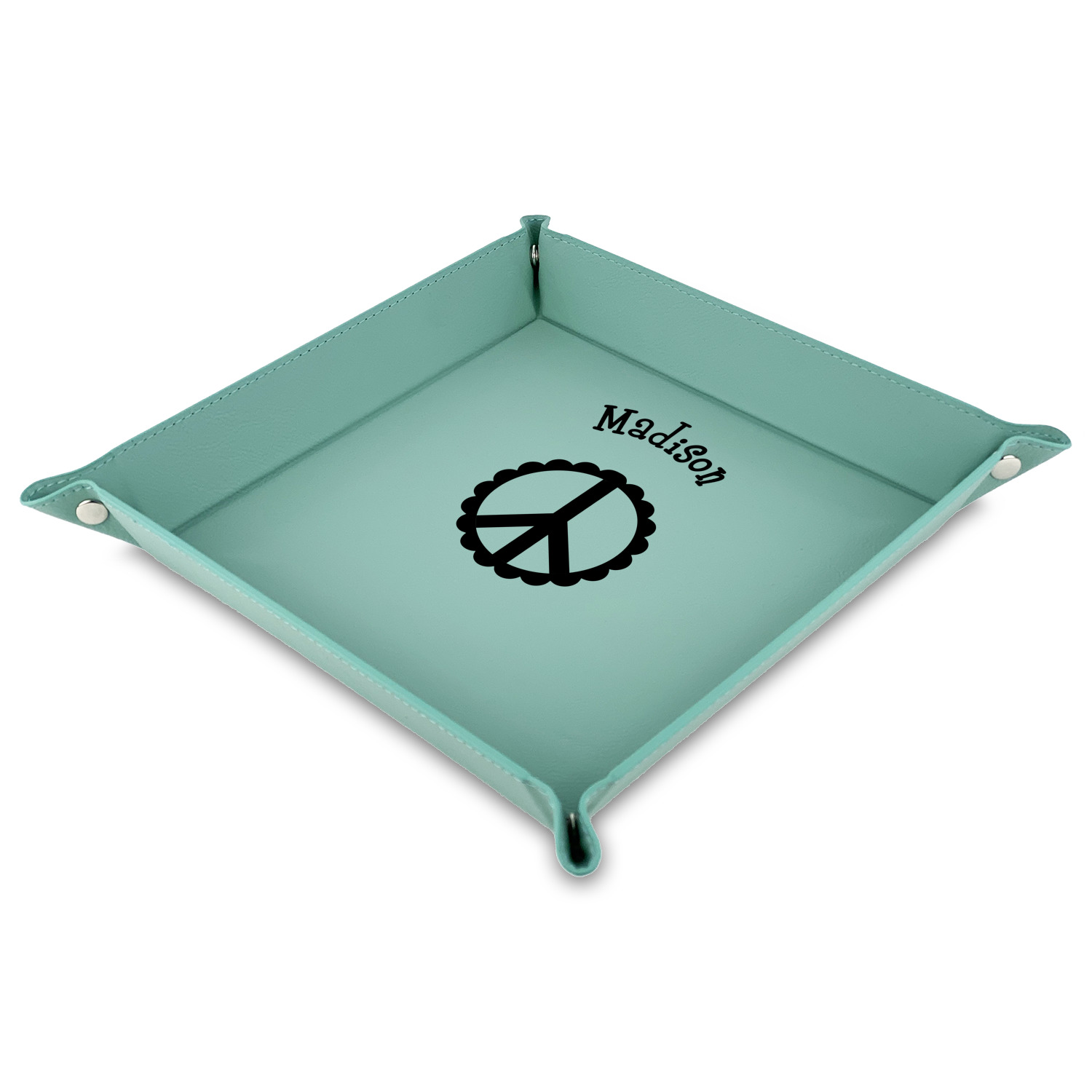 The leatherette wraps the hard board base and sides with flexible hinges to fold the sides up. The corners are secured using silver snaps. The 6in x 6 in tray measures approximately 9.5in x 9.5in when laid flat. The 9in x 9in tray measures approximately 13in x 13in when laid flat.