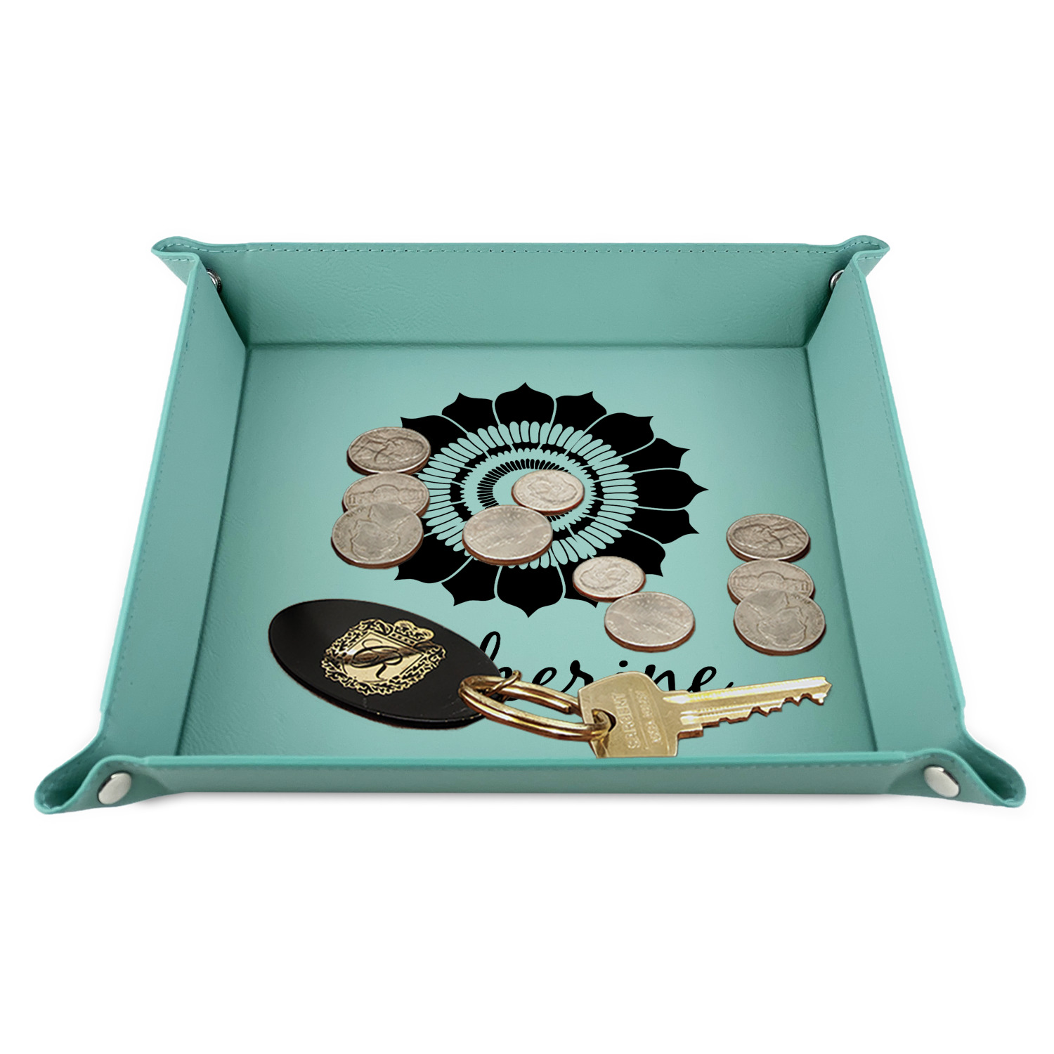The leatherette wraps the hard board base and sides with flexible hinges to fold the sides up. The corners are secured using silver snaps. The 6in x 6 in tray measures approximately 9.5in x 9.5in when laid flat. The 9in x 9in tray measures approximately 13in x 13in when laid flat.
