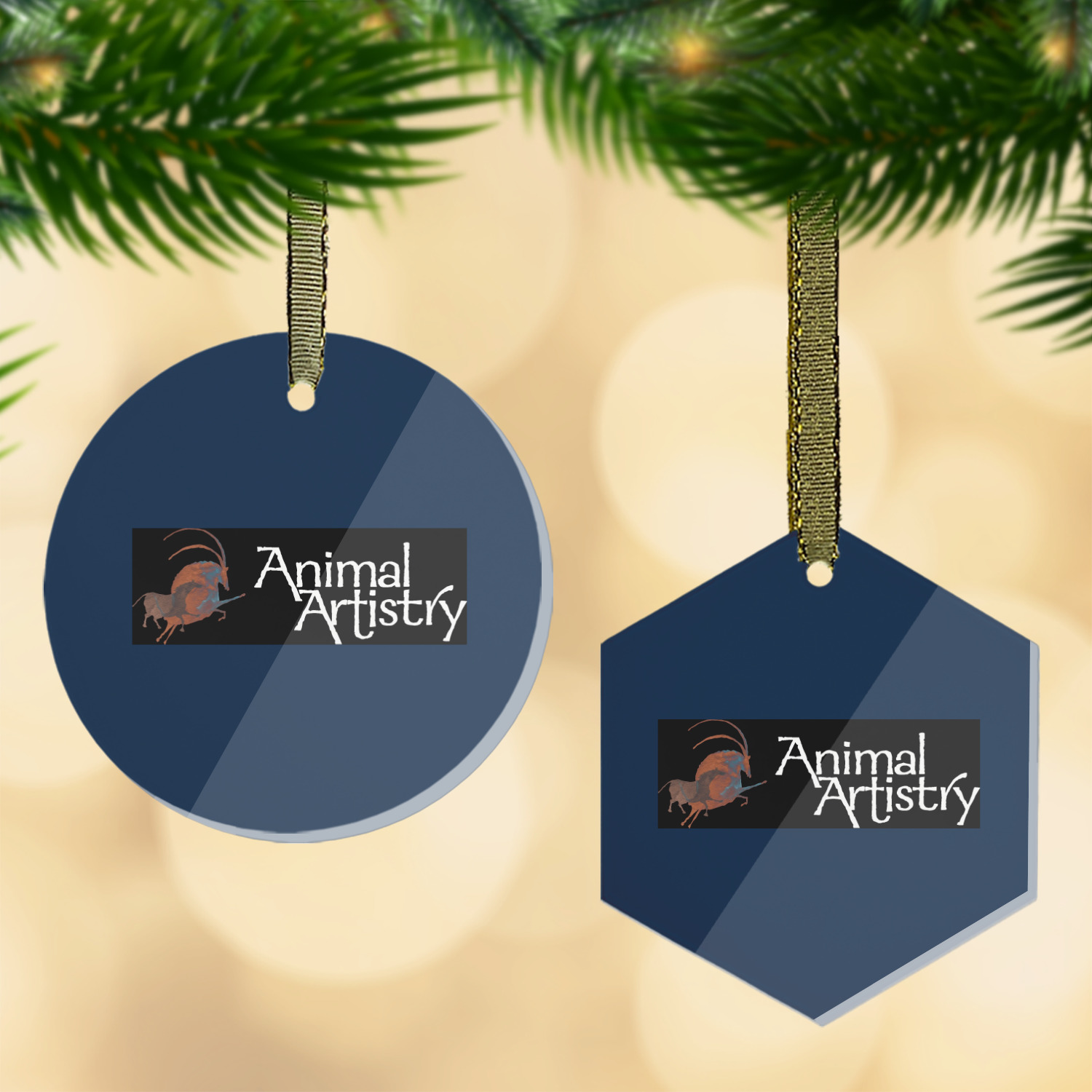 Each of our flat glass ornaments come with a gold string to hang on your Christmas tree with style! We offer two different shapes - flat, round ball or a hexagon. Both glass ornaments have a frosted coating on one side where we print your design while the other side is a clear gloss to give your personalized ornament a sheen finish. Our flat round glass ornament is approximately 3.5" x 3.5" while the flat hexagon ornaments are approximately 3.5" x 3".