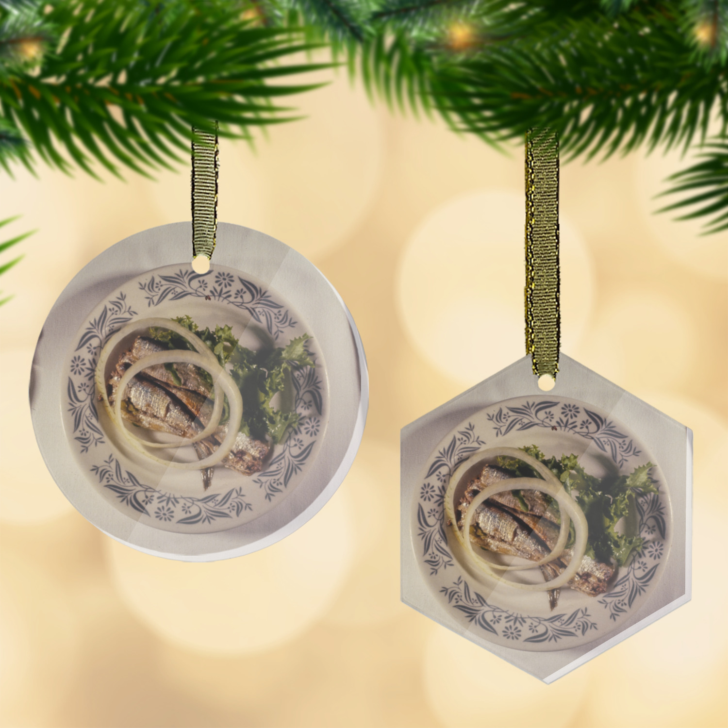 Each of our flat glass ornaments come with a gold string to hang on your Christmas tree with style! We offer two different shapes - flat, round ball or a hexagon. Both glass ornaments have a frosted coating on one side where we print your design while the other side is a clear gloss to give your personalized ornament a sheen finish. Our flat round glass ornament is approximately 3.5" x 3.5" while the flat hexagon ornaments are approximately 3.5" x 3".