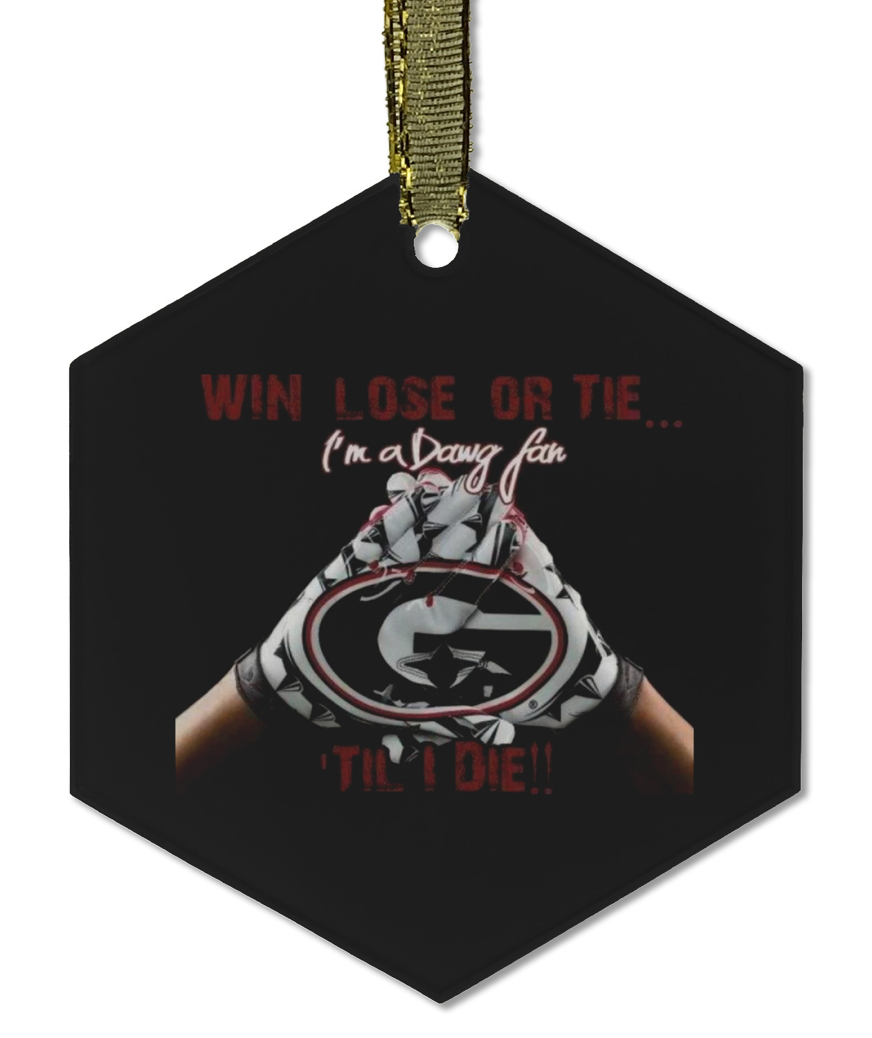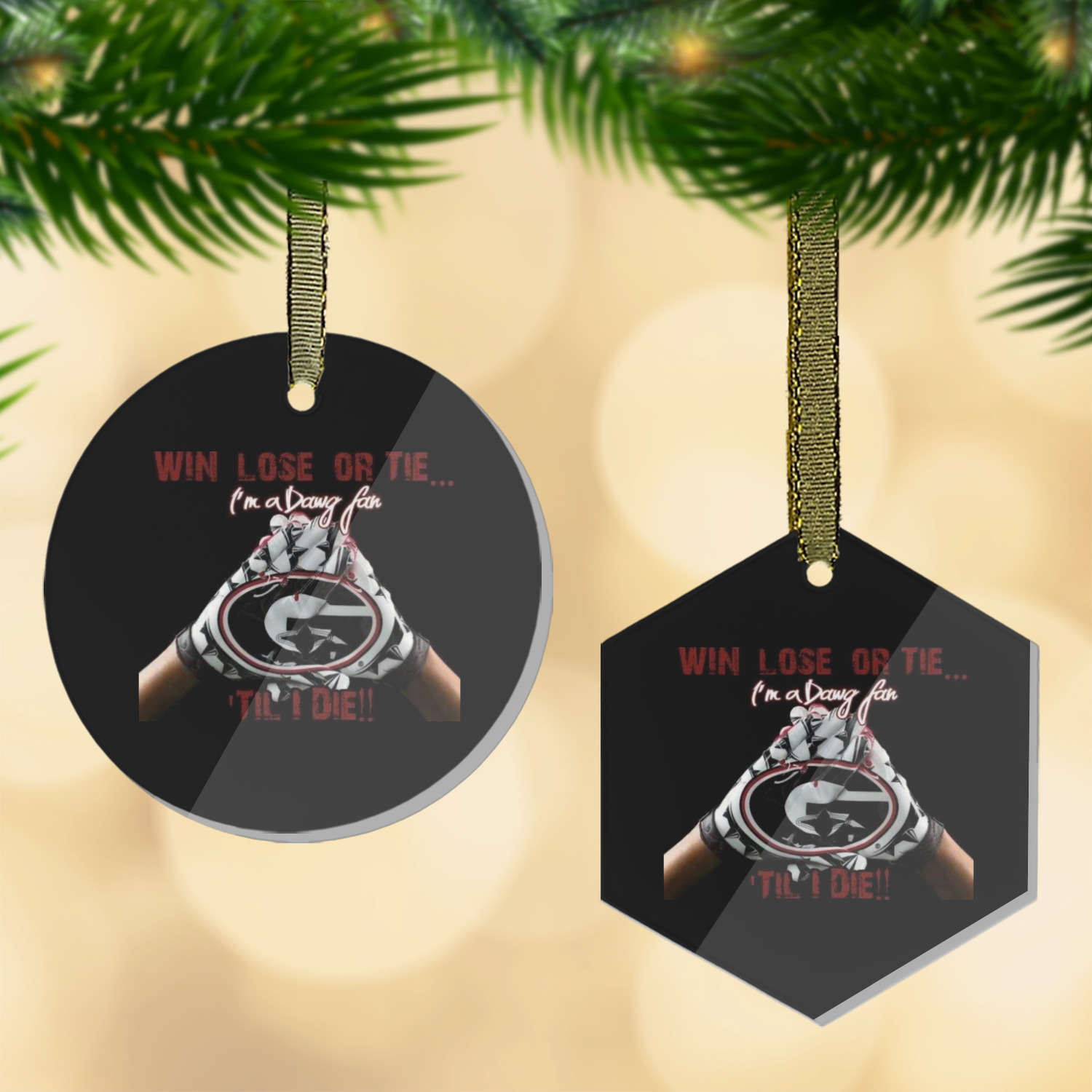 Each of our flat glass ornaments come with a gold string to hang on your Christmas tree with style! We offer two different shapes - flat, round ball or a hexagon. Both glass ornaments have a frosted coating on one side where we print your design while the other side is a clear gloss to give your personalized ornament a sheen finish. Our flat round glass ornament is approximately 3.5" x 3.5" while the flat hexagon ornaments are approximately 3.5" x 3".