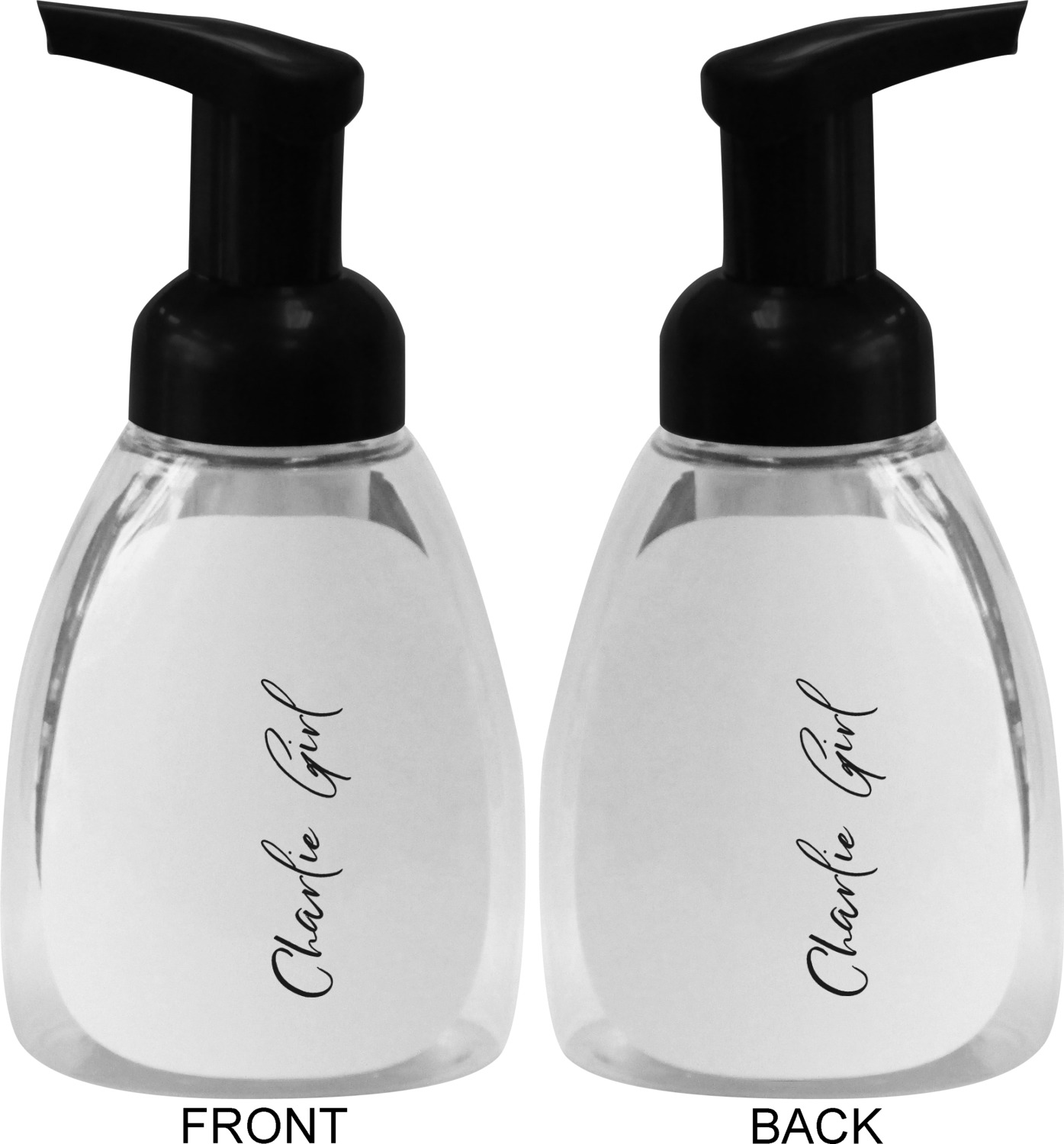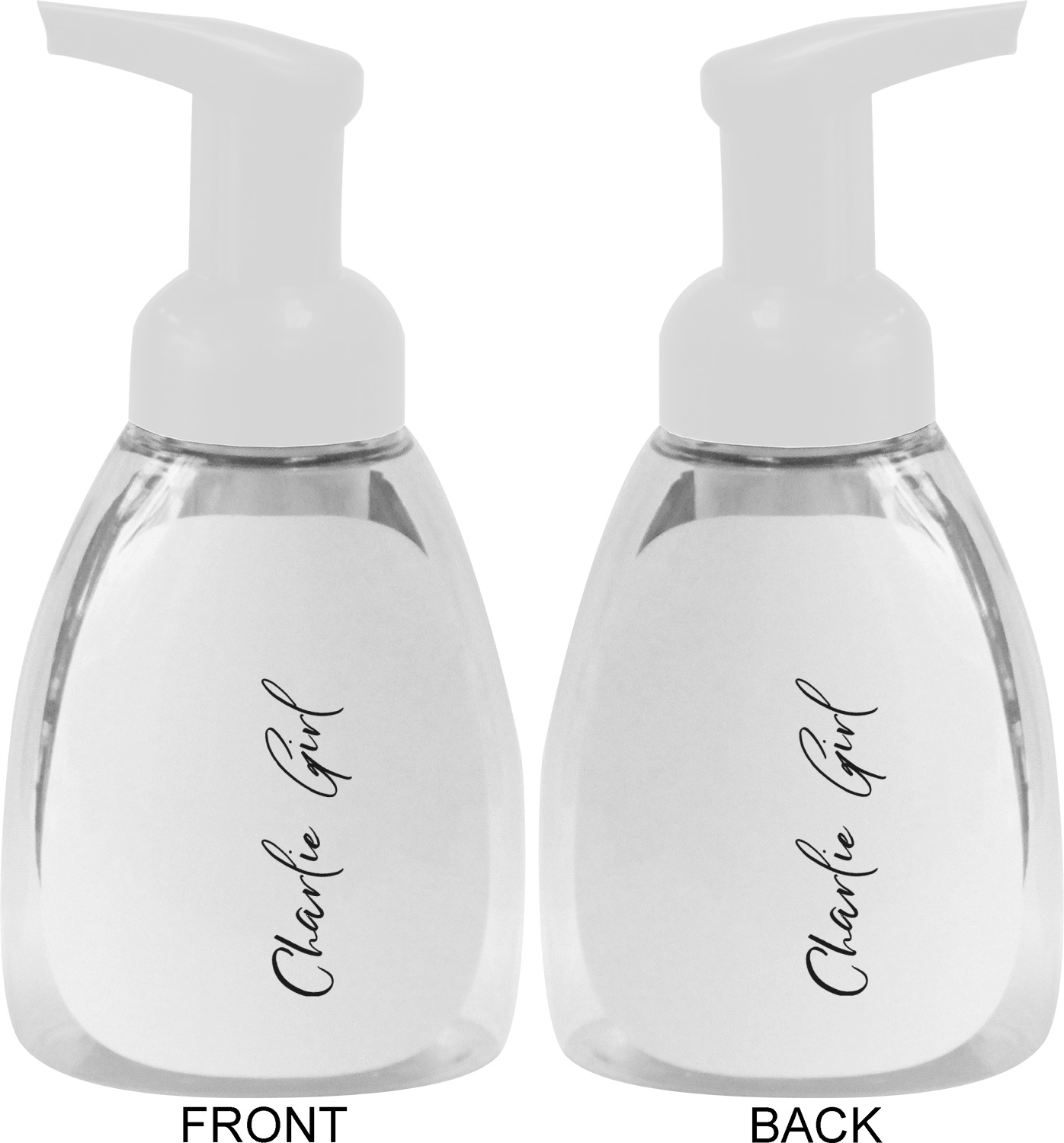 This soap dispenser is made of a robust plastic and has a clear base. The included soap pump is available in black or white color. This dispenser is 6.5 inches tall, 3 inches wide, and 2 inches deep. We display your customized designs on the front and back sides of these foaming hand soap dispensers.
