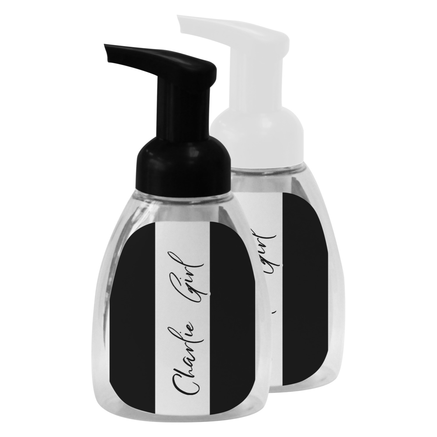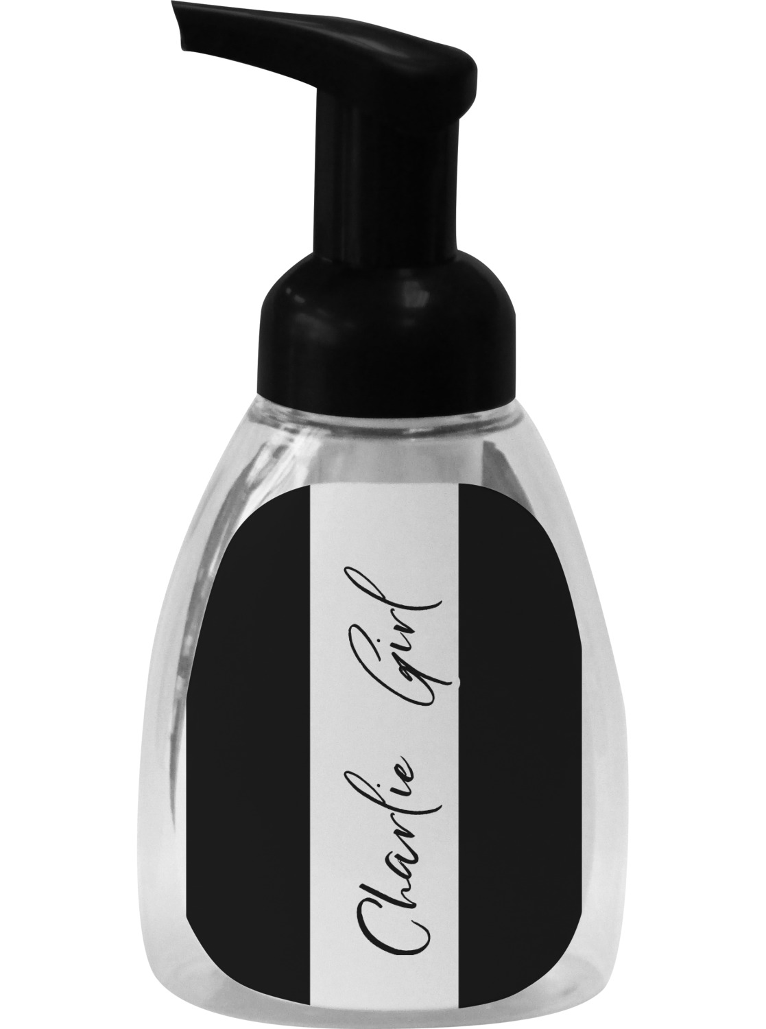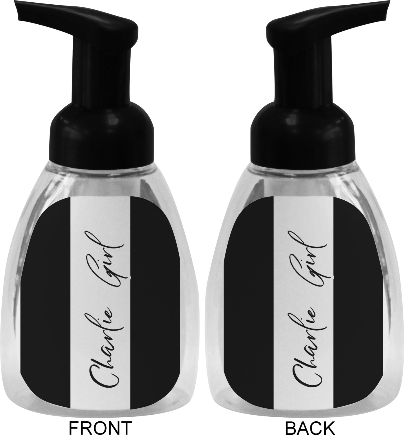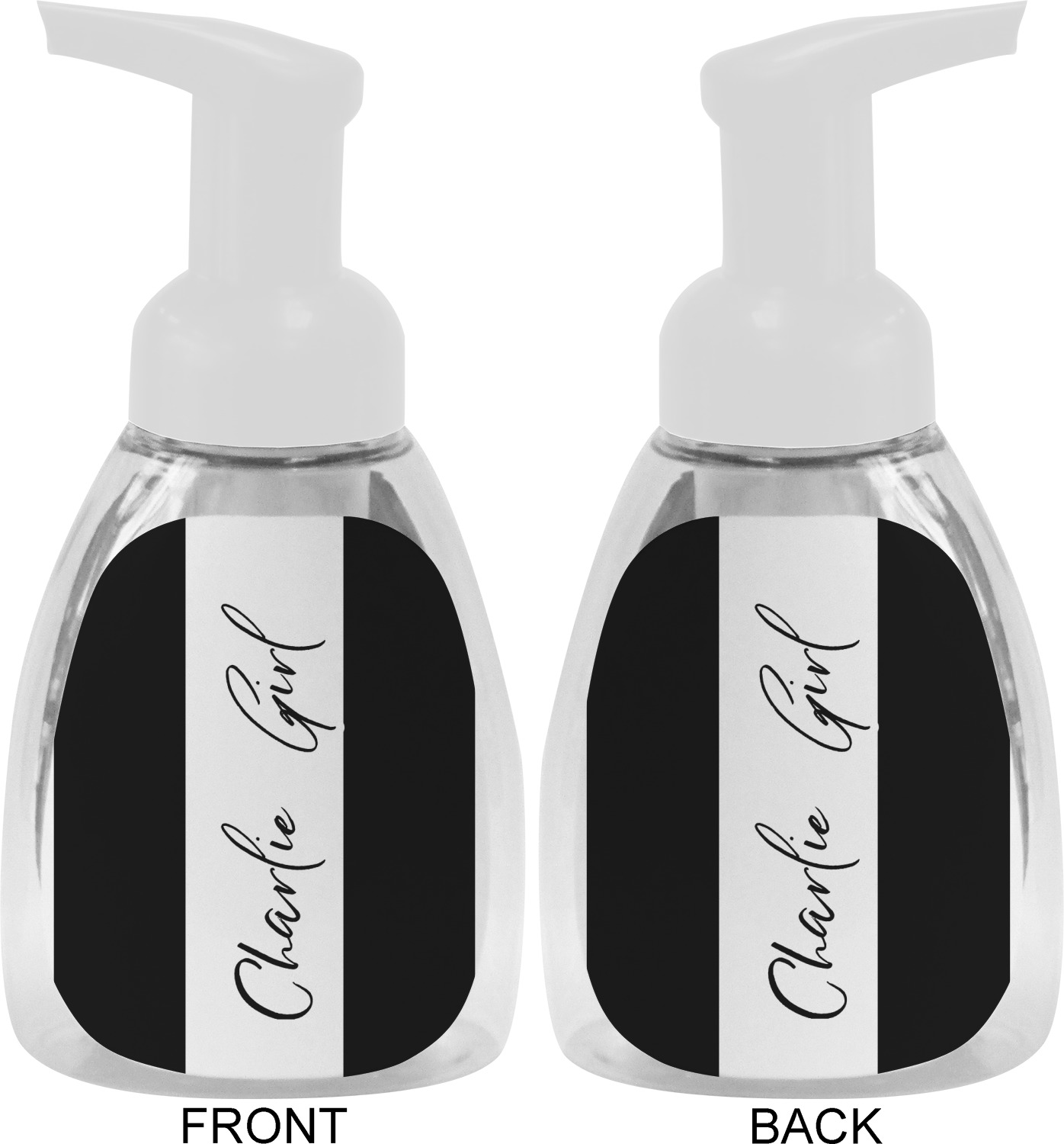 This soap dispenser is made of a robust plastic and has a clear base. The included soap pump is available in black or white color. This dispenser is 6.5 inches tall, 3 inches wide, and 2 inches deep. We display your customized designs on the front and back sides of these foaming hand soap dispensers.