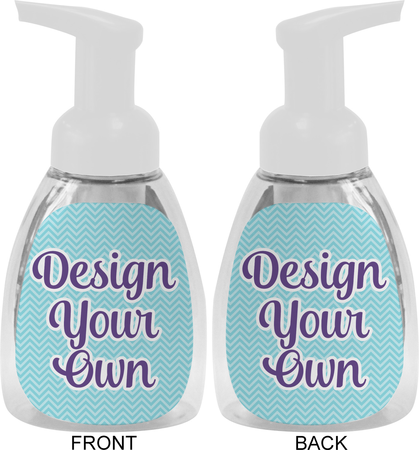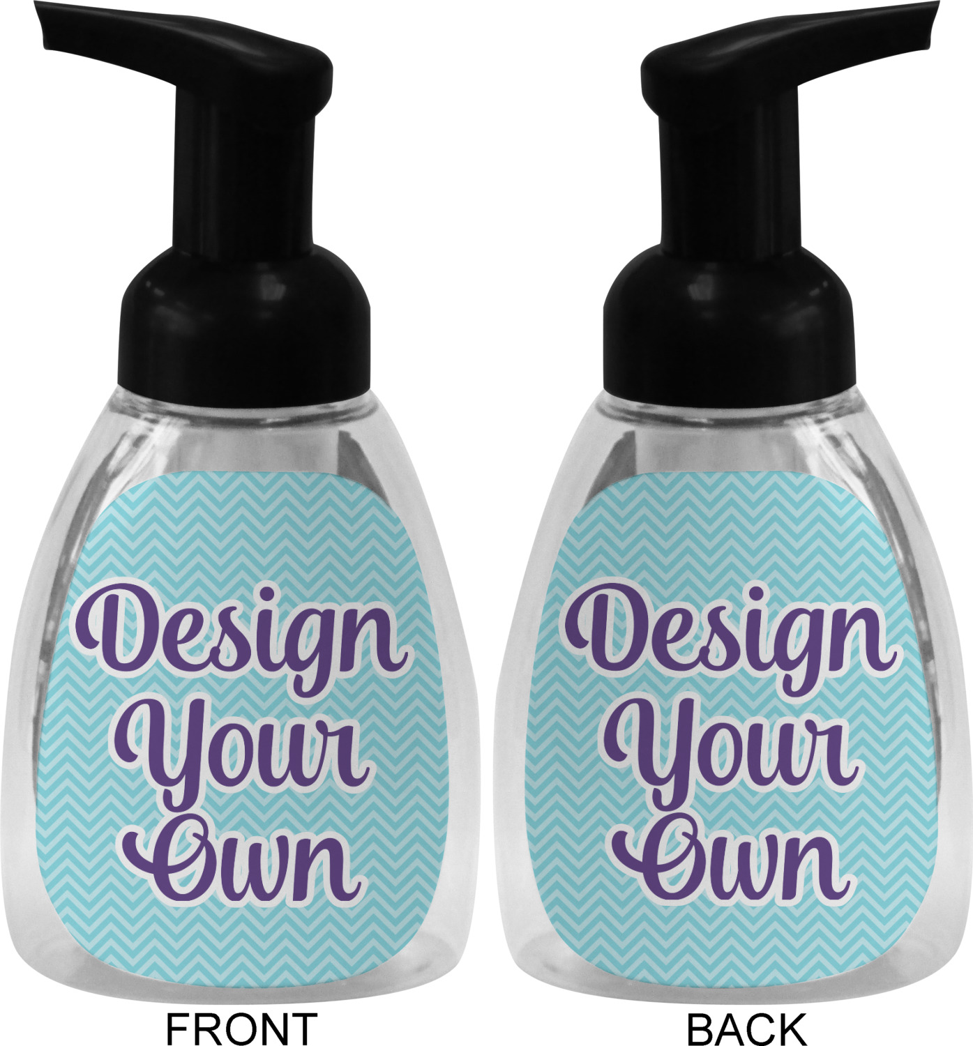This soap dispenser is made of a robust plastic and has a clear base. The included soap pump is available in black or white color. This dispenser is 6.5 inches tall, 3 inches wide, and 2 inches deep. We display your customized designs on the front and back sides of these foaming hand soap dispensers.