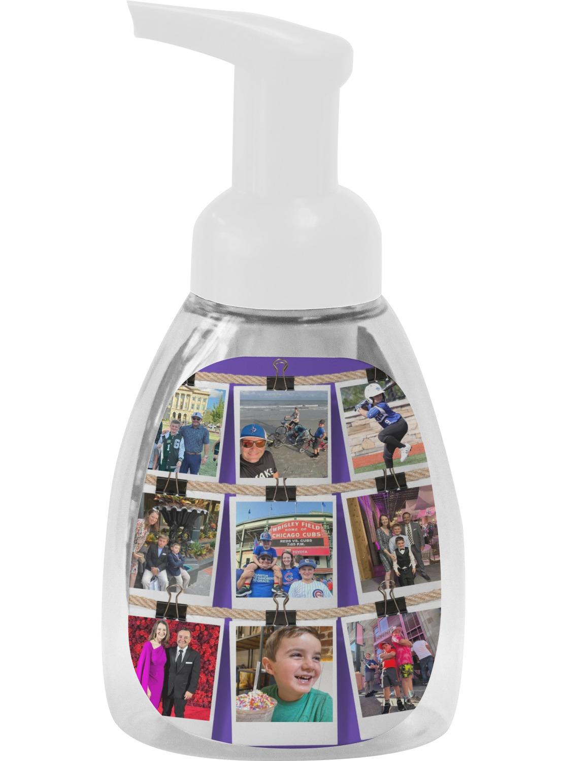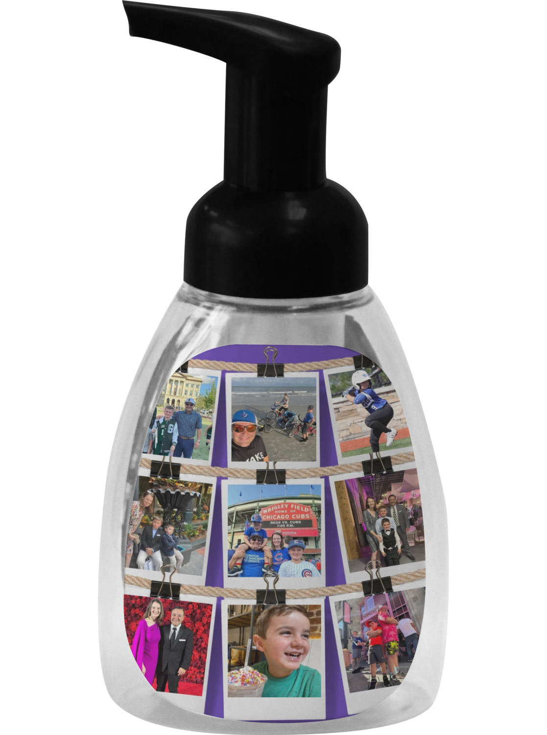 This soap dispenser is made of a robust plastic and has a clear base. The included soap pump is available in black or white color. This dispenser is 6.5 inches tall, 3 inches wide, and 2 inches deep. We display your customized designs on the front and back sides of these foaming hand soap dispensers.