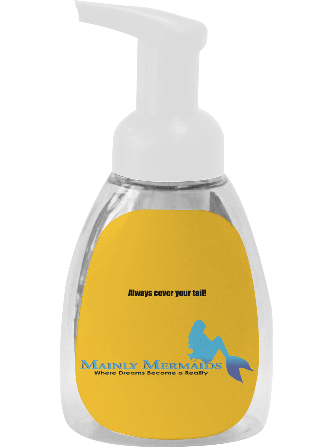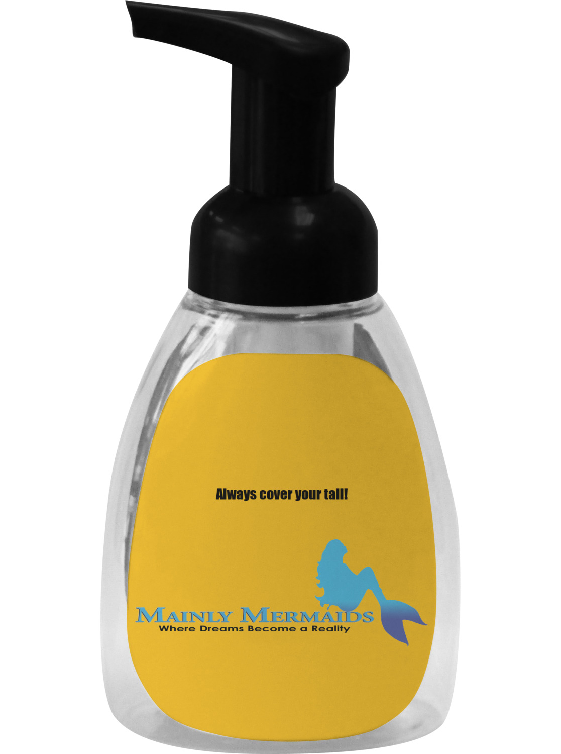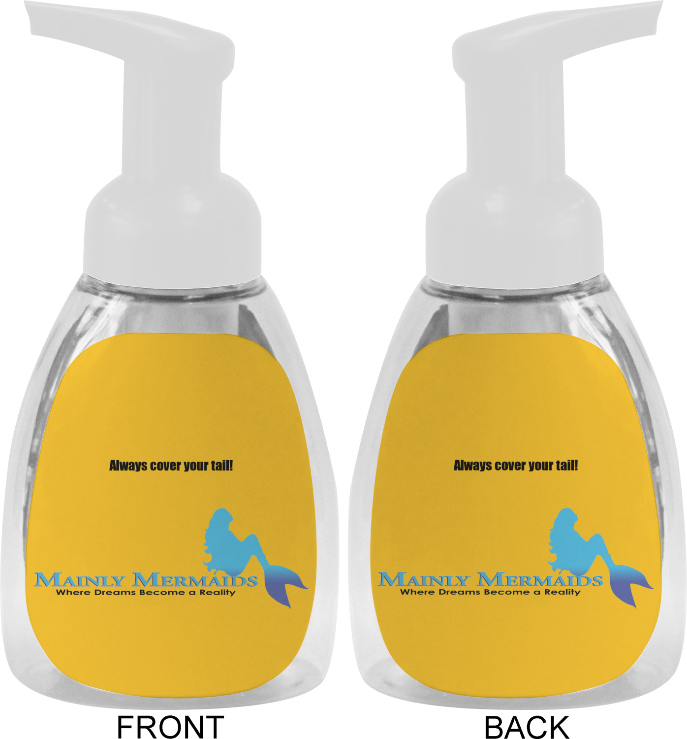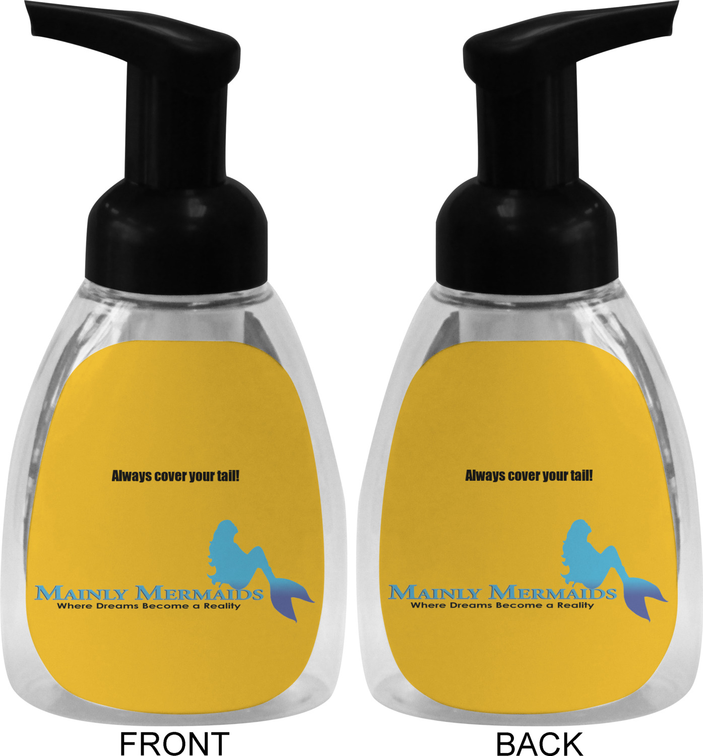This soap dispenser is made of a robust plastic and has a clear base. The included soap pump is available in black or white color. This dispenser is 6.5 inches tall, 3 inches wide, and 2 inches deep. We display your customized designs on the front and back sides of these foaming hand soap dispensers.
