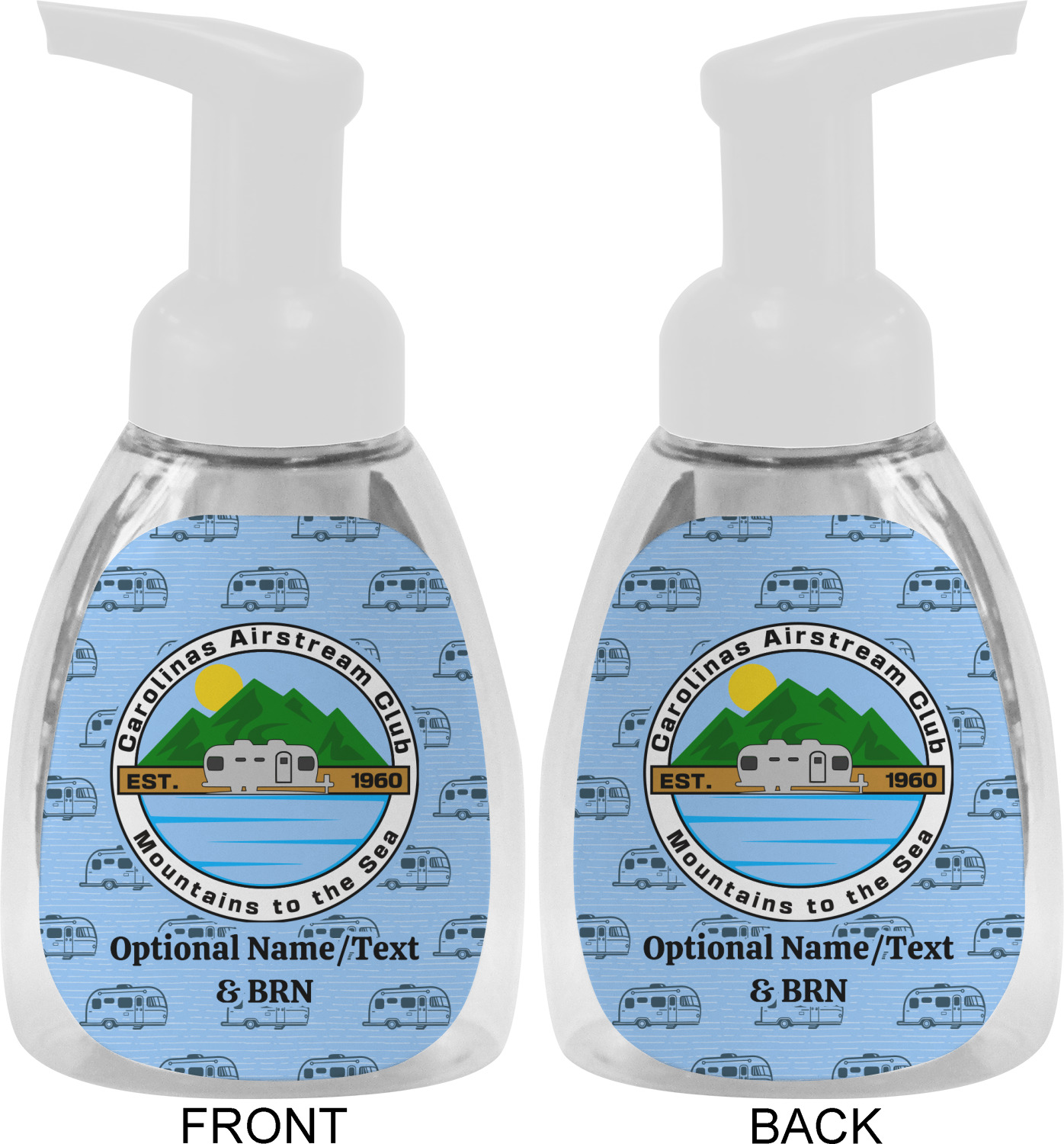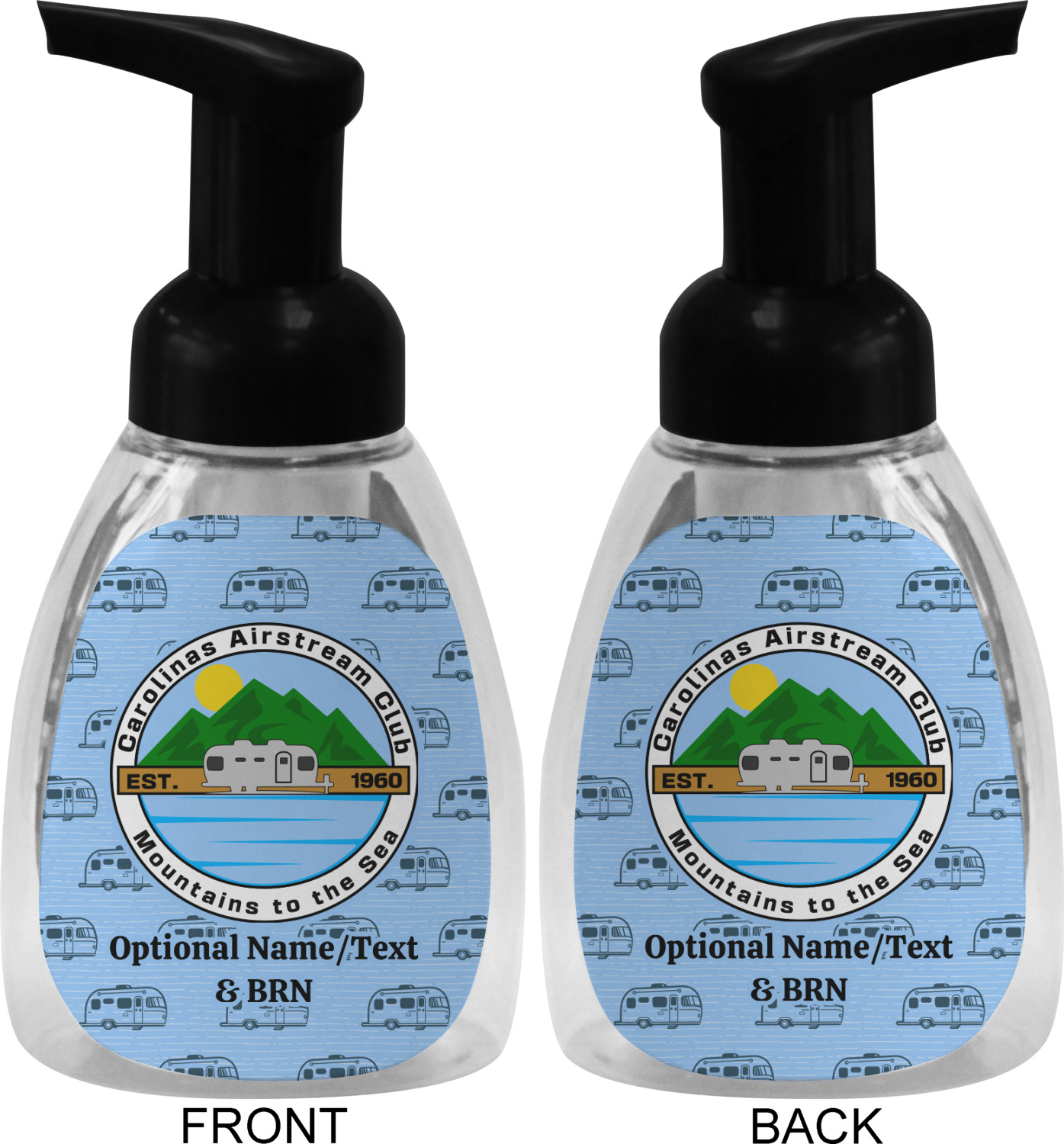 This soap dispenser is made of a robust plastic and has a clear base. The included soap pump is available in black or white color. This dispenser is 6.5 inches tall, 3 inches wide, and 2 inches deep. We display your customized designs on the front and back sides of these foaming hand soap dispensers.