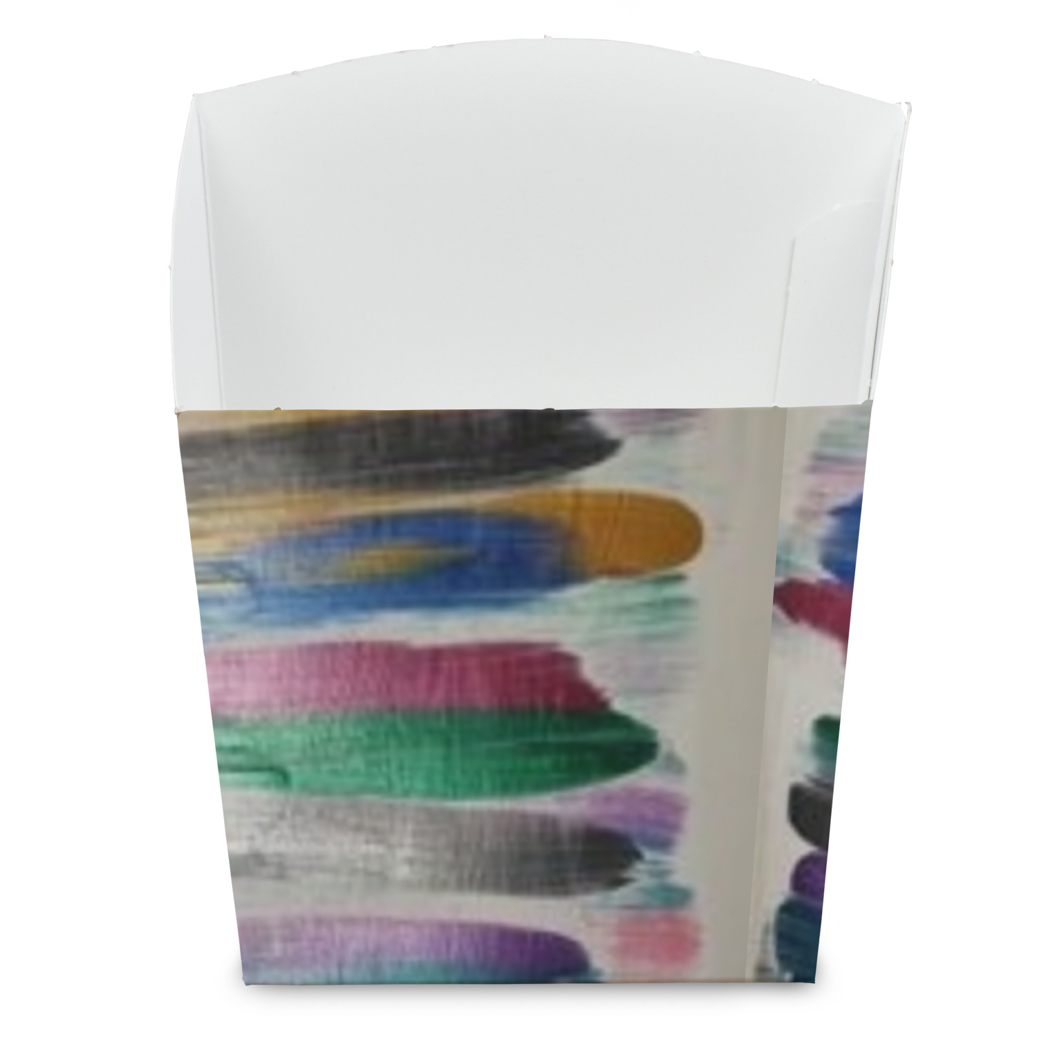 Since it is an open box, it works very well as a party snack cup (instead of plates) for different types of dry snacks and treats such as popcorn, cheezies, pretzels, chips, twizzlers, etc. This box can easily be carried with a drink all in one hand!