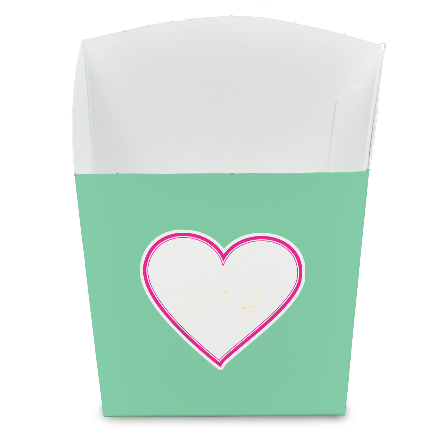 Since it is an open box, it works very well as a party snack cup (instead of plates) for different types of dry snacks and treats such as popcorn, cheezies, pretzels, chips, twizzlers, etc. This box can easily be carried with a drink all in one hand!