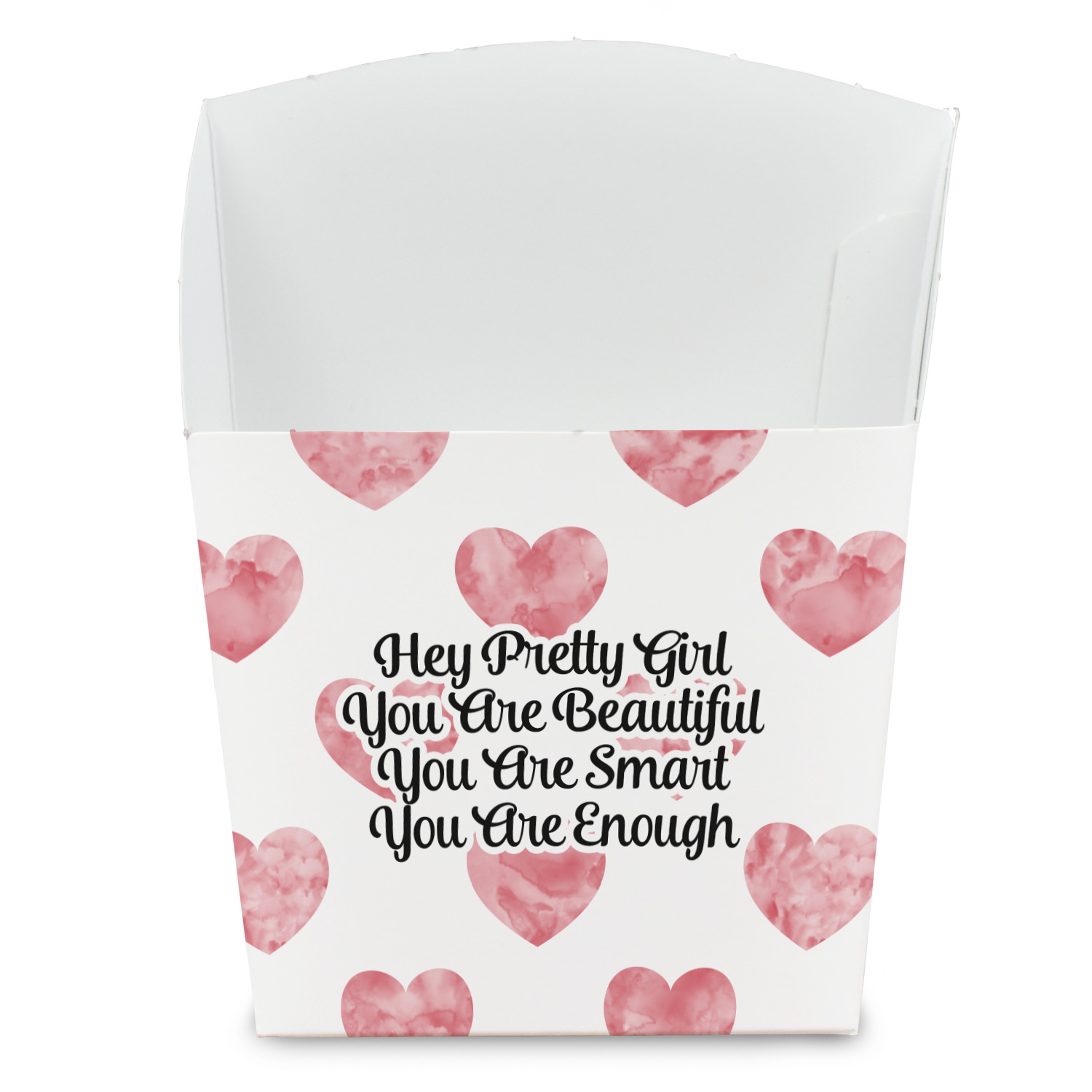 Since it is an open box, it works very well as a party snack cup (instead of plates) for different types of dry snacks and treats such as popcorn, cheezies, pretzels, chips, twizzlers, etc. This box can easily be carried with a drink all in one hand!