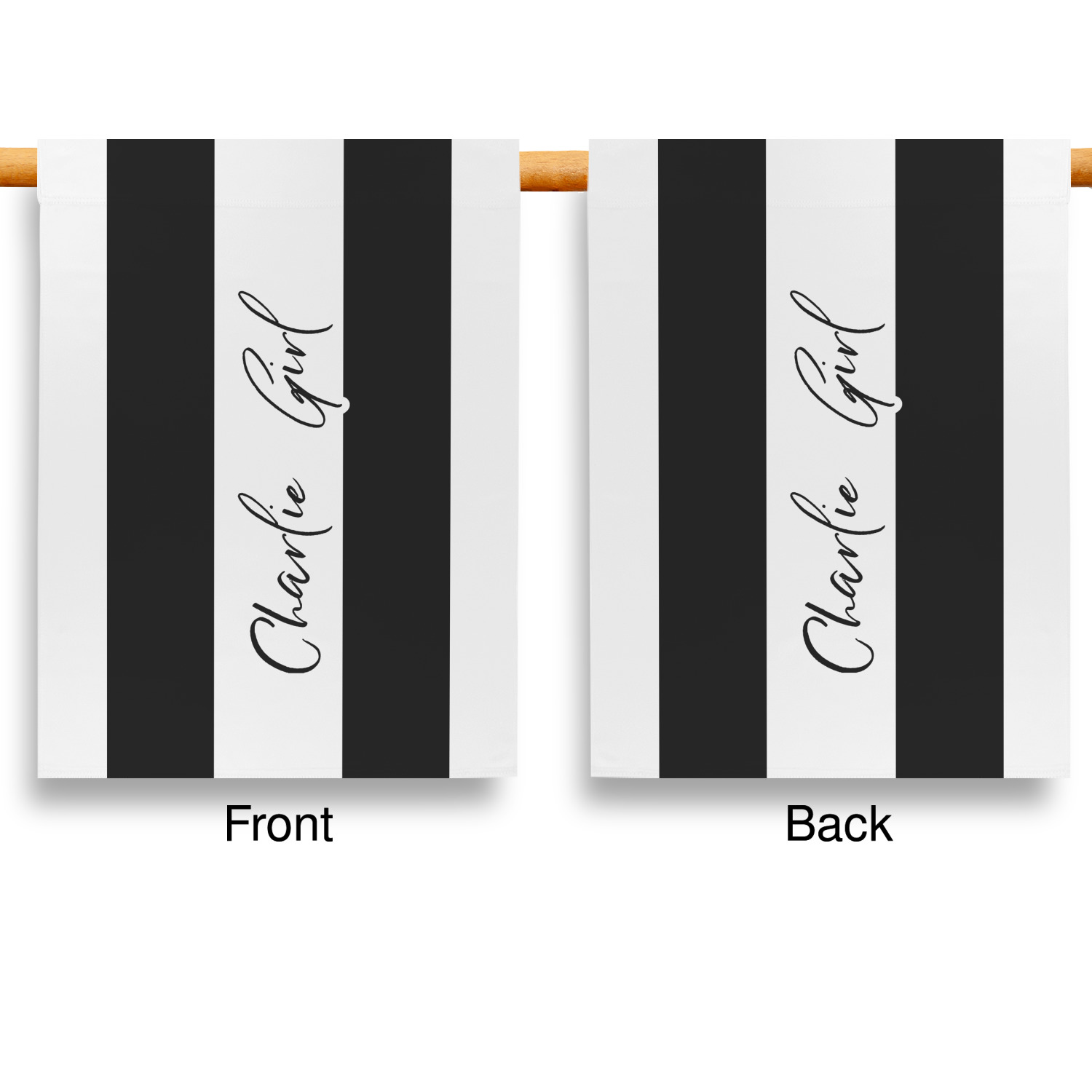 These custom garden flags are made of a durable, double-ply, polyester weave, allowing them to withstand the elements year round. The small flags measure at approximately 12 by 18 inches. The large flags measure out to 28 by 37 inches. You can order these decorative flags with your customization printed on the front only, or the front and back.