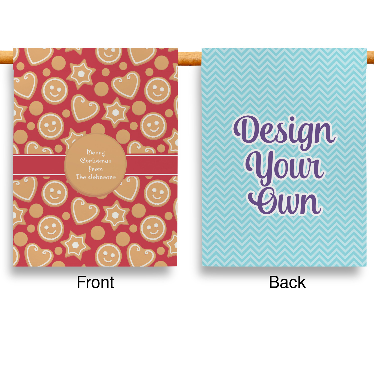 These custom garden flags are made of a durable, double-ply, polyester weave, allowing them to withstand the elements year round. The small flags measure at approximately 12 by 18 inches. The large flags measure out to 28 by 37 inches. You can order these decorative flags with your customization printed on the front only, or the front and back.