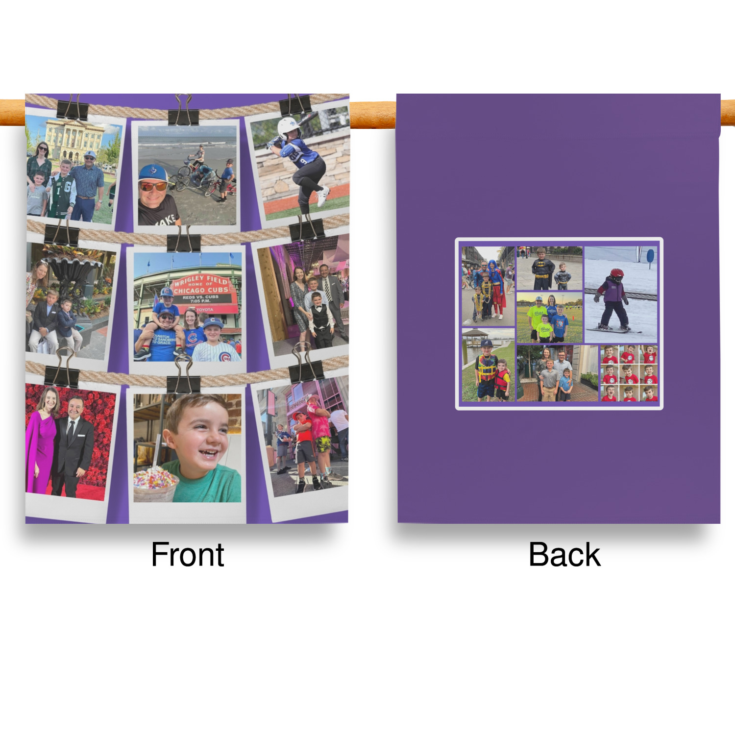 These custom garden flags are made of a durable, double-ply, polyester weave, allowing them to withstand the elements year round. The small flags measure at approximately 12 by 18 inches. The large flags measure out to 28 by 37 inches. You can order these decorative flags with your customization printed on the front only, or the front and back.