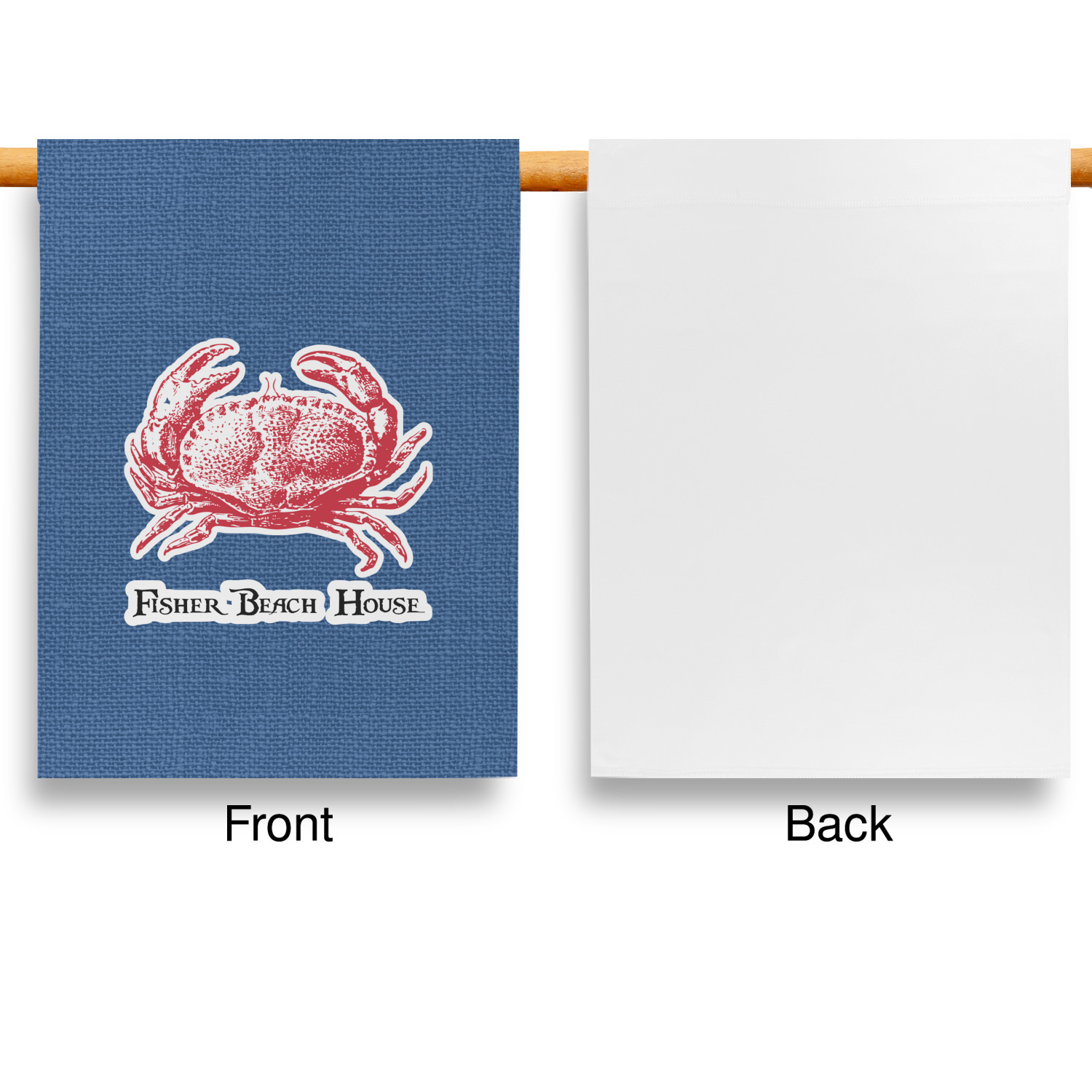 These custom garden flags are made of a durable, double-ply, polyester weave, allowing them to withstand the elements year round. The small flags measure at approximately 12 by 18 inches. The large flags measure out to 28 by 37 inches. You can order these decorative flags with your customization printed on the front only, or the front and back.