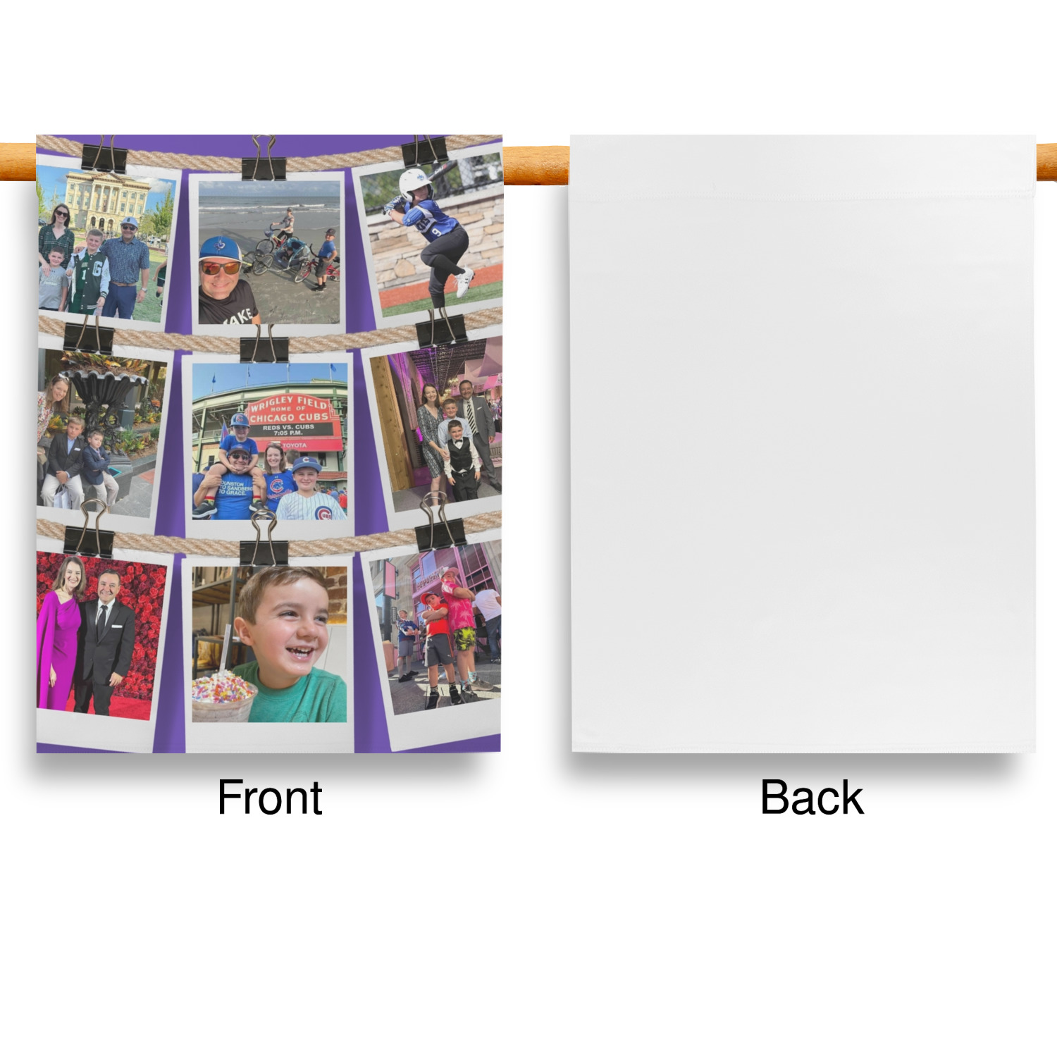 These custom garden flags are made of a durable, double-ply, polyester weave, allowing them to withstand the elements year round. The small flags measure at approximately 12 by 18 inches. The large flags measure out to 28 by 37 inches. You can order these decorative flags with your customization printed on the front only, or the front and back.