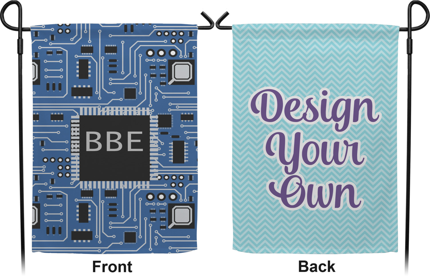 These custom garden flags are made of a durable, double-ply, polyester weave, allowing them to withstand the elements year round. The small flags measure at approximately 12 by 18 inches. The large flags measure out to 28 by 37 inches. You can order these decorative flags with your customization printed on the front only, or the front and back.