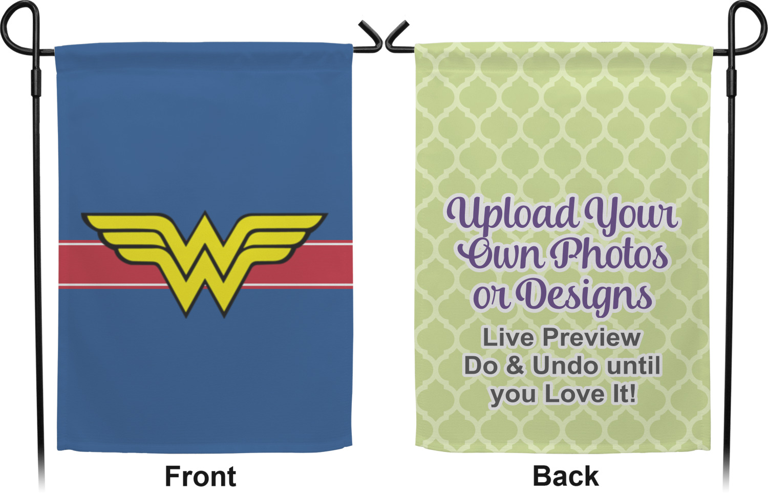 These custom garden flags are made of a durable, double-ply, polyester weave, allowing them to withstand the elements year round. The small flags measure at approximately 12 by 18 inches. The large flags measure out to 28 by 37 inches. You can order these decorative flags with your customization printed on the front only, or the front and back.