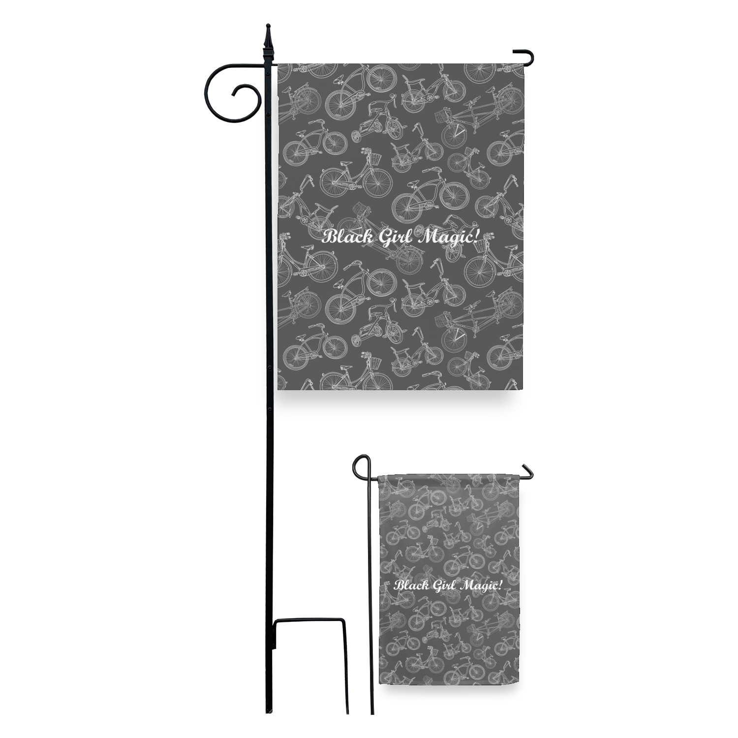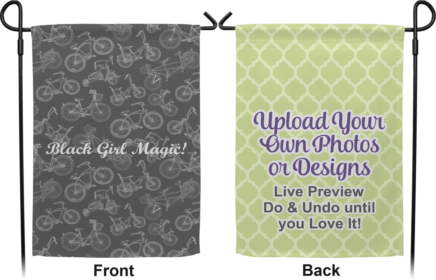 These custom garden flags are made of a durable, double-ply, polyester weave, allowing them to withstand the elements year round. The small flags measure at approximately 12 by 18 inches. The large flags measure out to 28 by 37 inches. You can order these decorative flags with your customization printed on the front only, or the front and back.