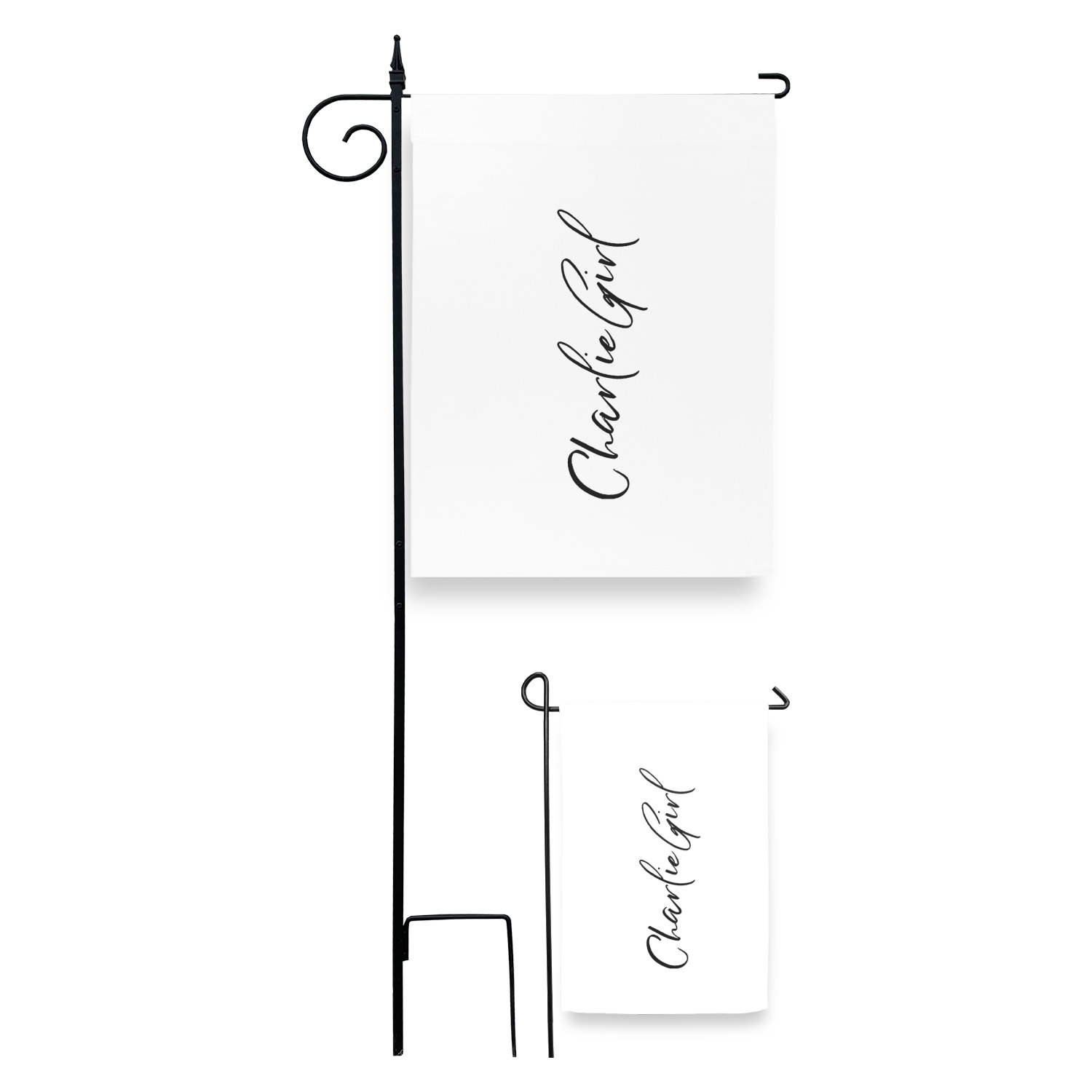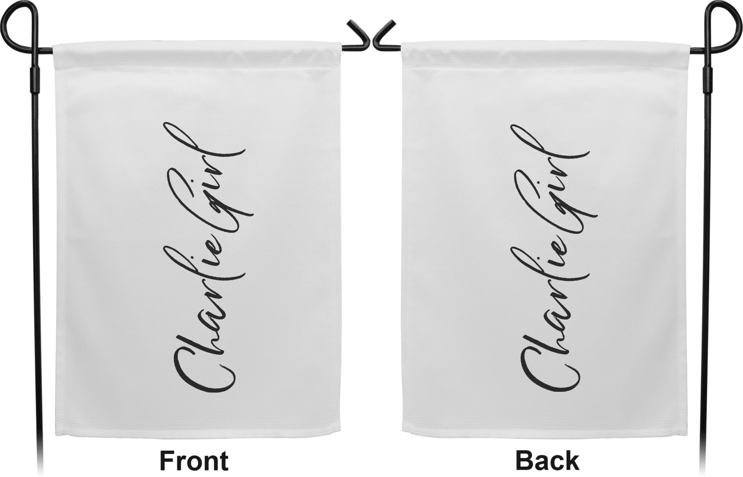 These custom garden flags are made of a durable, double-ply, polyester weave, allowing them to withstand the elements year round. The small flags measure at approximately 12 by 18 inches. The large flags measure out to 28 by 37 inches. You can order these decorative flags with your customization printed on the front only, or the front and back.
