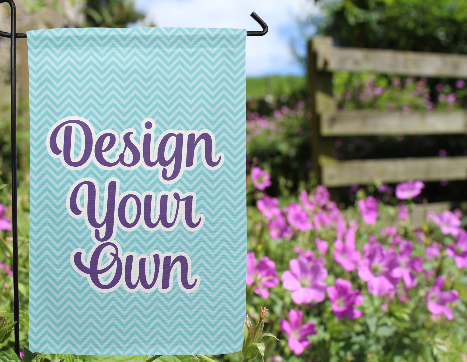 These custom garden flags are made of a durable, double-ply, polyester weave, allowing them to withstand the elements year round. The small flags measure at approximately 12 by 18 inches. The large flags measure out to 28 by 37 inches. You can order these decorative flags with your customization printed on the front only, or the front and back.