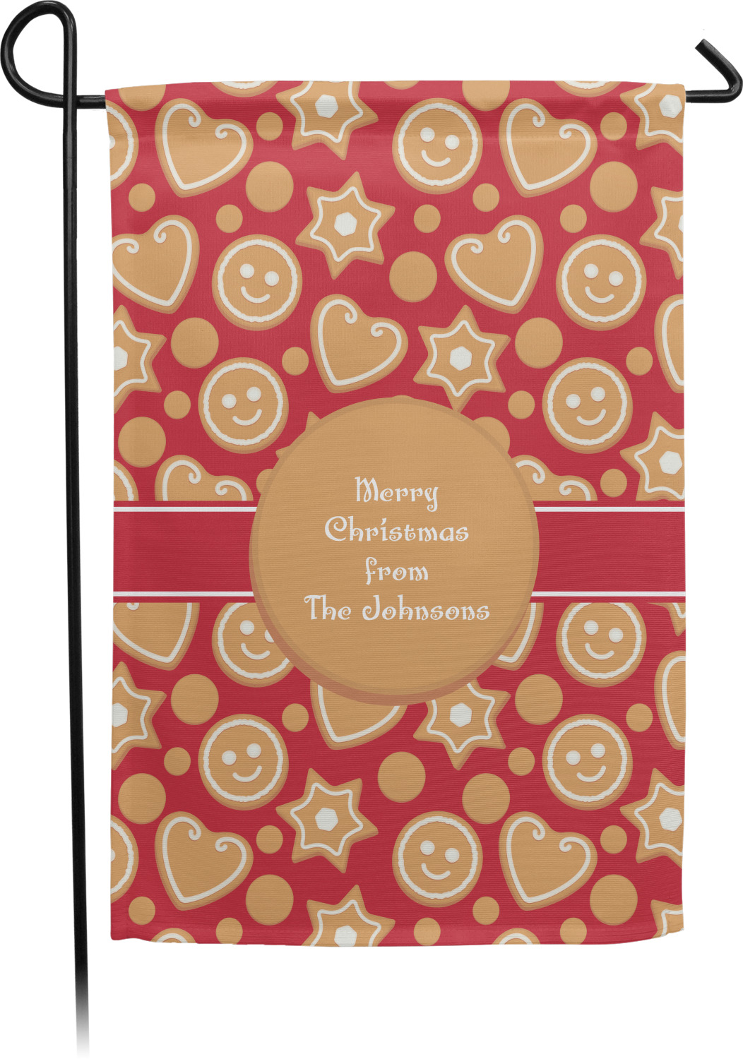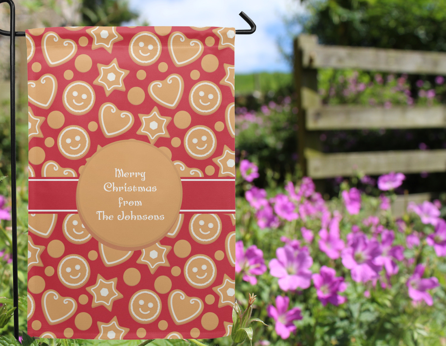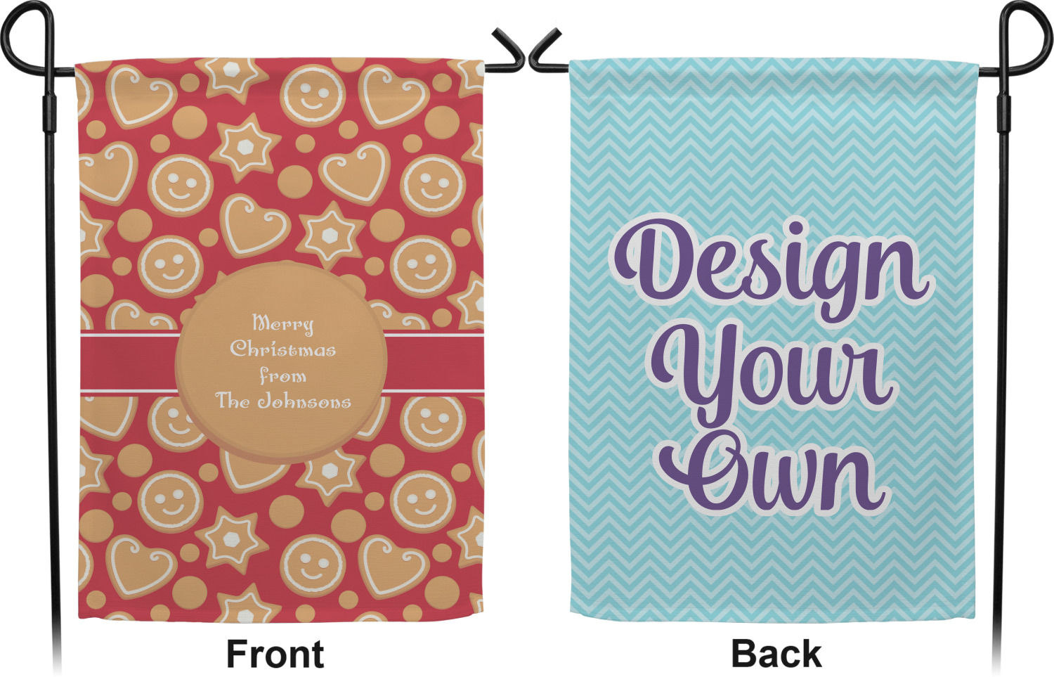 These custom garden flags are made of a durable, double-ply, polyester weave, allowing them to withstand the elements year round. The small flags measure at approximately 12 by 18 inches. The large flags measure out to 28 by 37 inches. You can order these decorative flags with your customization printed on the front only, or the front and back.