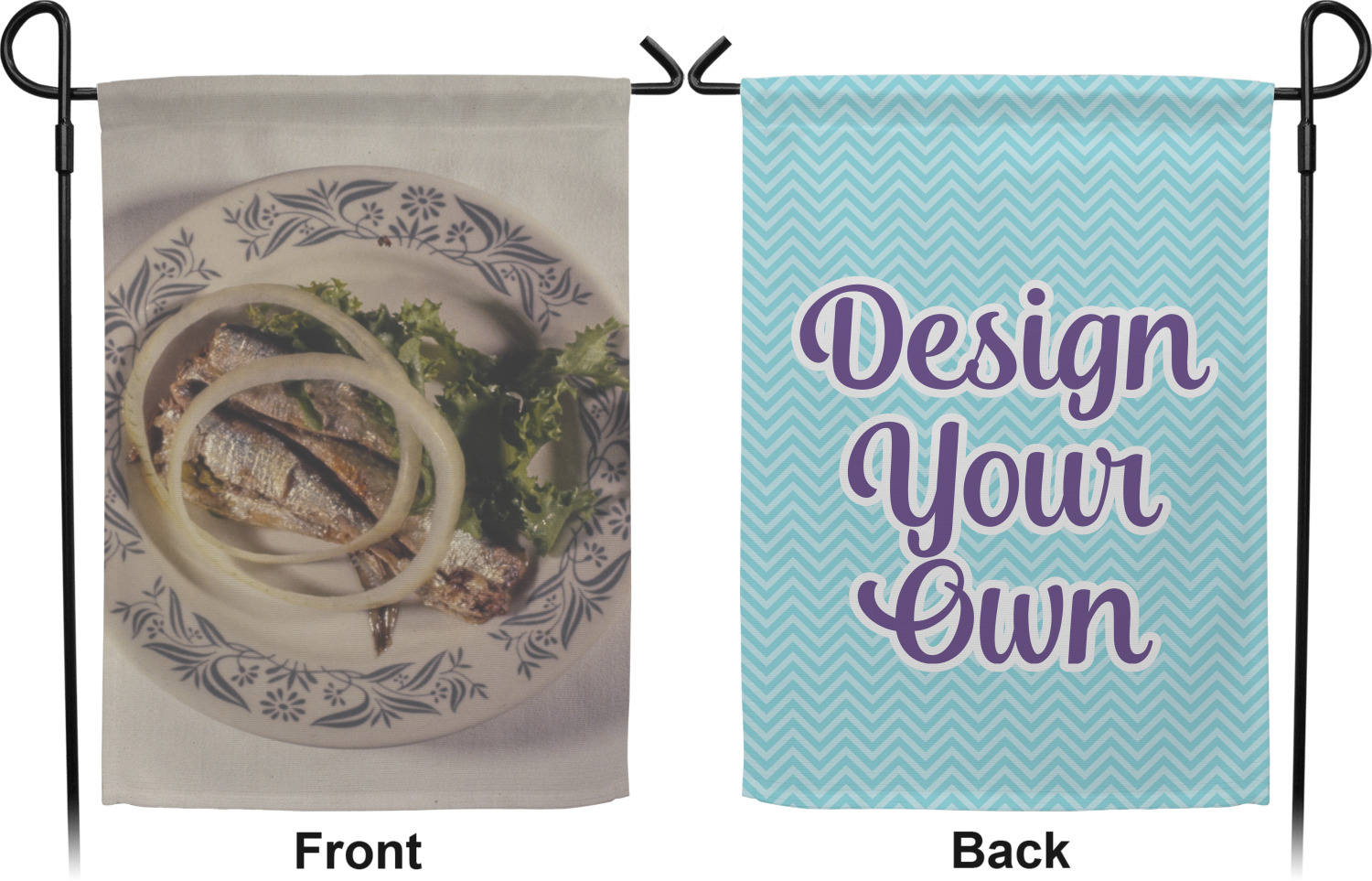 These custom garden flags are made of a durable, double-ply, polyester weave, allowing them to withstand the elements year round. The small flags measure at approximately 12 by 18 inches. The large flags measure out to 28 by 37 inches. You can order these decorative flags with your customization printed on the front only, or the front and back.