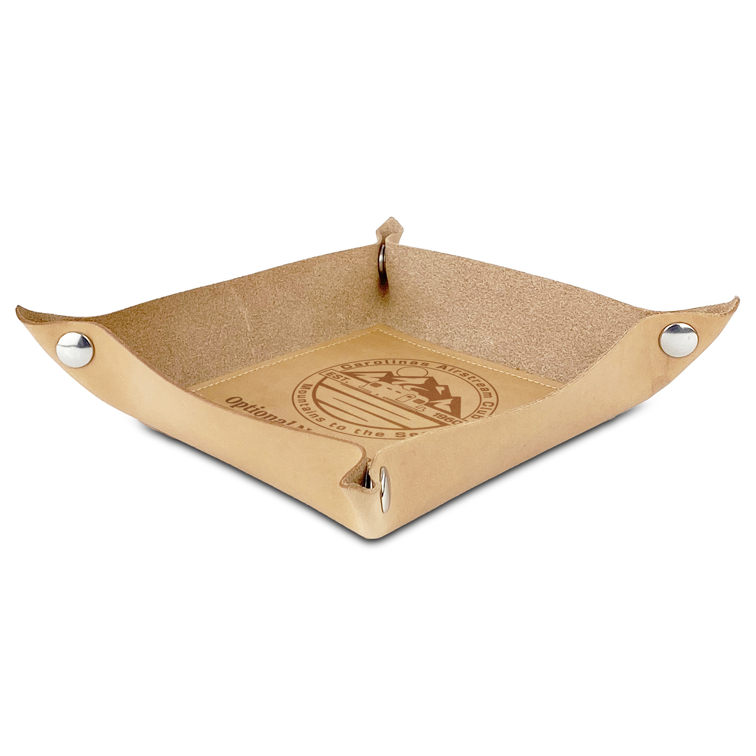 Available in one size (approximately 5.5" x 5.5" base), the natural veg, hermann oak finished genuine leather is made to hold up to heavy use over time. When closed it is approximately 1.5" deep to hold all of your necessities. Personalize it with laser engraving to add that personal touch. Folds flat for storage and the corners snap together to make a great tray.