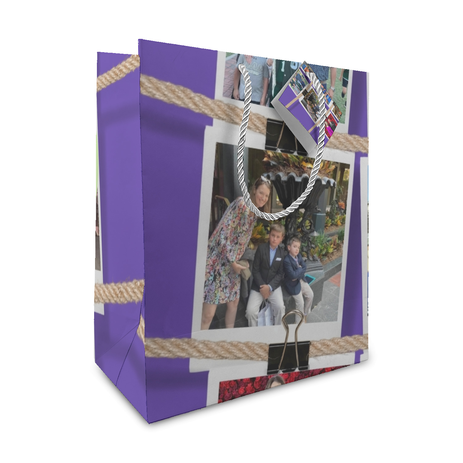 Our gift bags are digitally printed in full color on a premium heavy weight paper. The bags are then cut, scored & folded. The silver rope handles are then attached to the gift bag, along with the gift card.