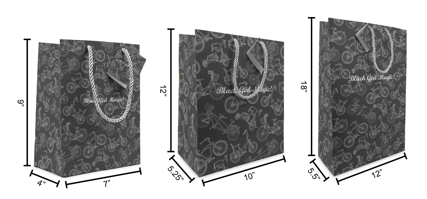| Size (Varies By Option) | Small Gift Bag (7" x 4" x 9") Medium Gift Bag (10" x 5.25" x 12") Large Gift Bag (12" x 5.5" x 18") |