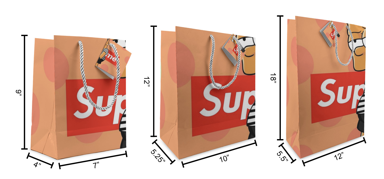 These custom gift bags come in your choice of 3 sizes. Their dimensions are below:
