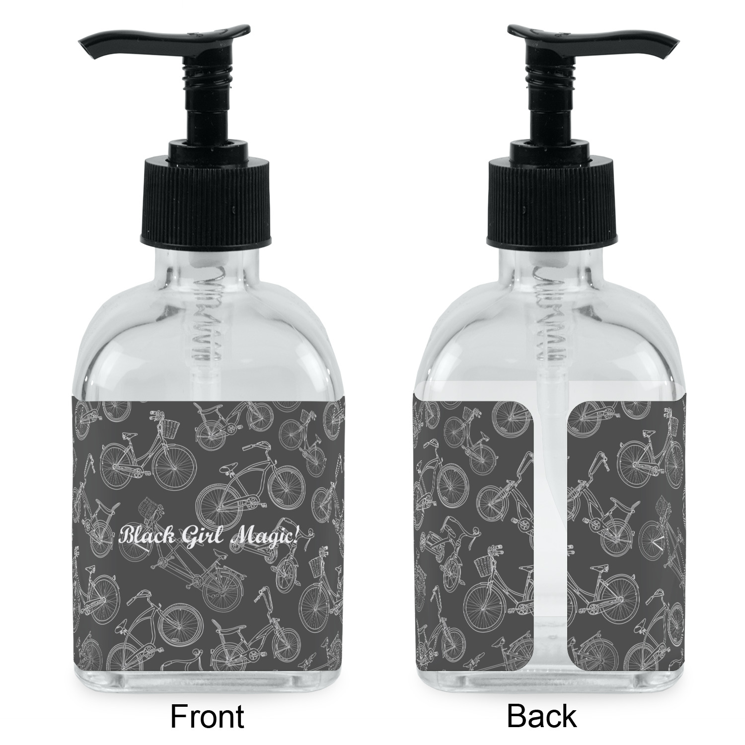 Crafted from a high-quality glass, these soap dispensers and lotion dispensers are durable and robust, while still looking elegant. They are sold with black pumps. Each soap dispenser pump measures at 6.5 by 2.25 inches. On these soap pumps, we display your customized design on a personalized vinyl adhesive on three sides. That way, you can judge how much liquid is in the bottles from the back.