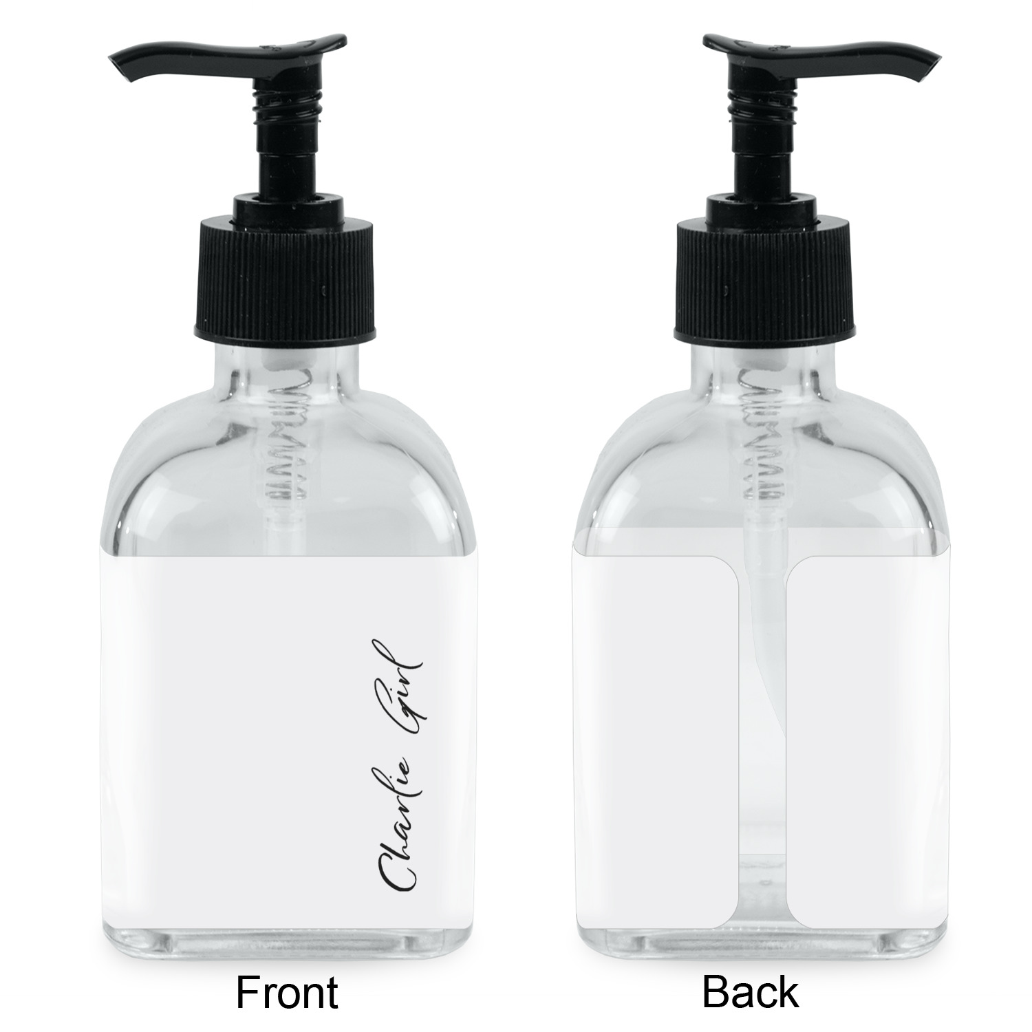 Crafted from a high-quality glass, these soap dispensers and lotion dispensers are durable and robust, while still looking elegant. They are sold with black pumps. Each soap dispenser pump measures at 6.5 by 2.25 inches. On these soap pumps, we display your customized design on a personalized vinyl adhesive on three sides. That way, you can judge how much liquid is in the bottles from the back.