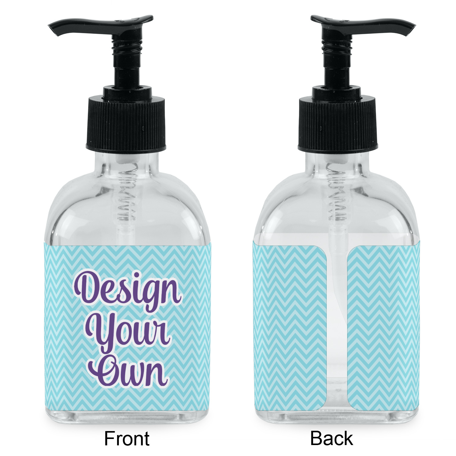 Crafted from a high-quality glass, these soap dispensers and lotion dispensers are durable and robust, while still looking elegant. They are sold with black pumps. Each soap dispenser pump measures at 6.5 by 2.25 inches. On these soap pumps, we display your customized design on a personalized vinyl adhesive on three sides. That way, you can judge how much liquid is in the bottles from the back.