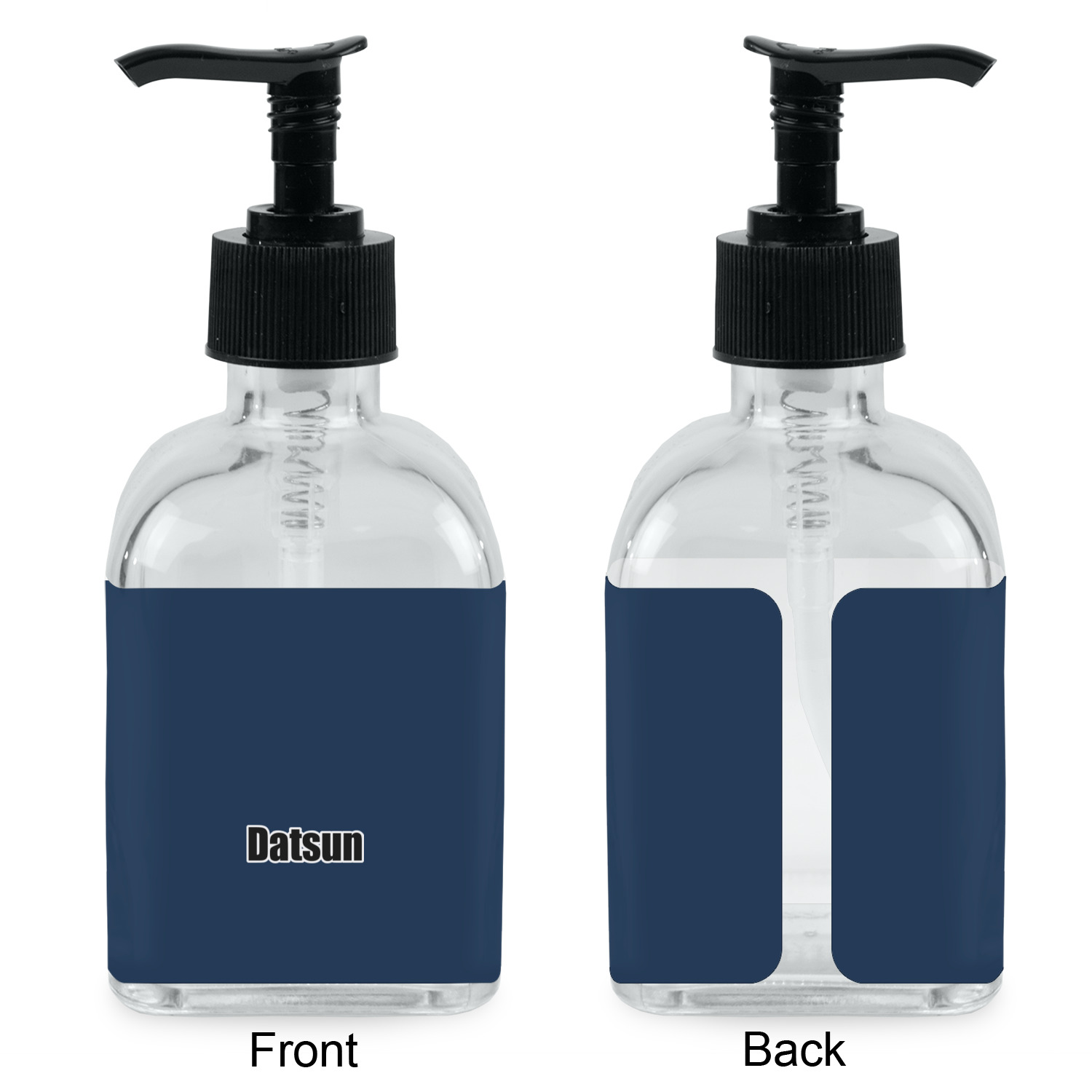 Crafted from a high-quality glass, these soap dispensers and lotion dispensers are durable and robust, while still looking elegant. They are sold with black pumps. Each soap dispenser pump measures at 6.5 by 2.25 inches. On these soap pumps, we display your customized design on a personalized vinyl adhesive on three sides. That way, you can judge how much liquid is in the bottles from the back.
