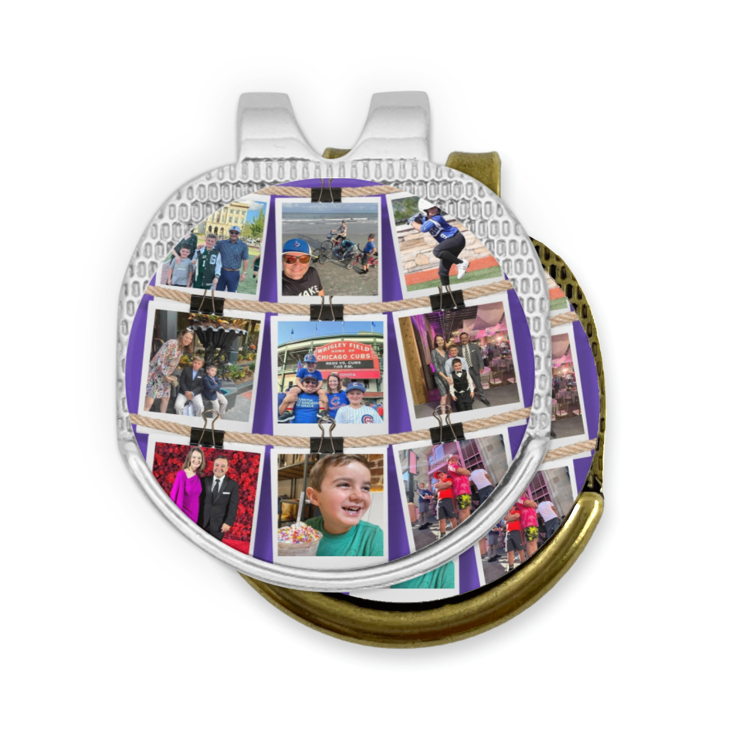 This round shaped little clip is simply 1.25" x 1.5". A clip wraps around to the back of the ball marker holder in order to be able to clip it to the bill of your hat or even your belt. The metal ball marker attaches by a magnet on the clip. Available in stainless steel natural finish or gold finish, you are sure to find one to suit your style. This makes for convenient removal when you need to use it. No more digging in your bag or pockets trying to find it!
