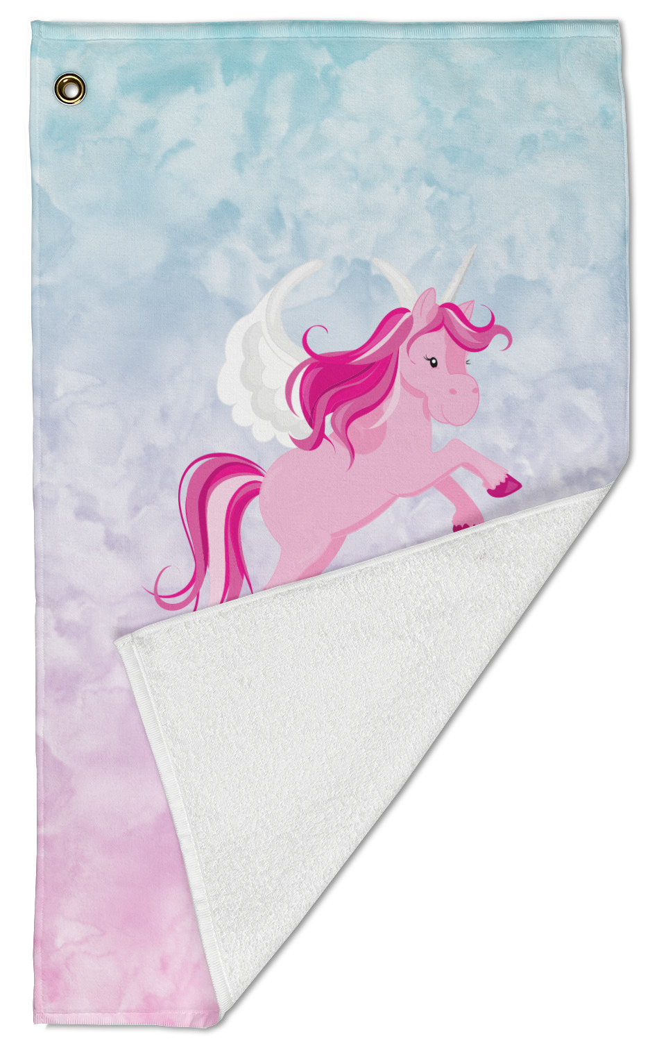 The towel is fully printed / patterned on the front polyester side; and is white on terrycloth cotton backside. The towel has grommet and a pear spring clip in the top left corner. Our golf towels are available in 100s of different prints and patterns.